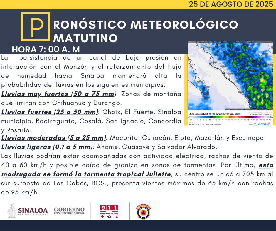 Asimismo, se informa que durante la madrugada de este lunes, se formó la tormenta tropical Juliette, la cual se encuentra a 705 kilómetros al sur-suroeste de Los Cabos, Baja California Sur; actualmente, presenta rachas de vientos de 65 km/h y rachas de 95km/h.