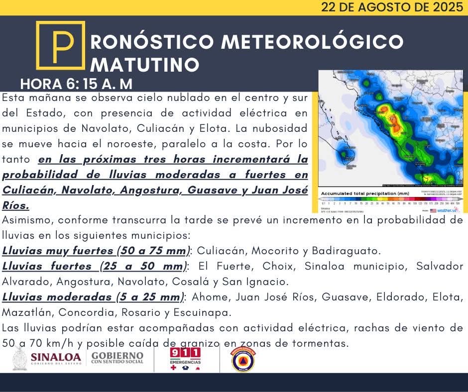 Mazatlán, Sinaloa, 22 de agosto de 2025.– Cielo nublado en los municipios del centro y sur de Sinaloa, con incremento en las probabilidad de lluvias, y temperaturas de 35 a 39 grados centígrados, refleja el modelo de pronóstico para este día viernes en el estado.