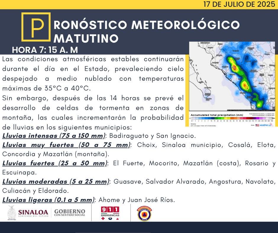 Mazatlán, Sinaloa, 17 de julio de 2025.– Los modelos predictivos climáticos para el estado de Sinaloa refieren cielos despejados con temperaturas de 35 a 40 grados centígrados, y con probabilidad de formación de celdas de tormenta para la tarde de este jueves 17 de julio.
