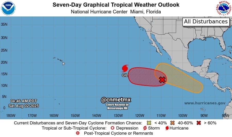 Ciudad de México, 2 de agosto de 2025. – El monitoreo meteorológico en el océano Pacífico registra la presencia del huracán Gil y el posible desarrollo de nuevos sistemas tropicales en los próximos días, informó el Servicio Meteorológico Nacional.