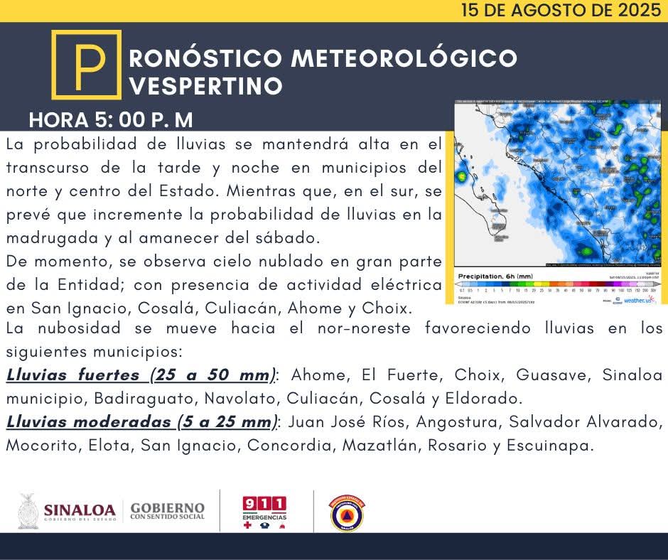 Mazatlán, Sinaloa, 15 de agosto de 2025.– La presencia de bandas nubosas en gran parte del estado de Sinaloa, traerán consigo incremento en la probabilidad de lluvias; en lo que respecta a los municipios del sur, se prevén precipitaciones durante la madrugada de este sábado, informó la Coordinación Municipal de Protección Civil.