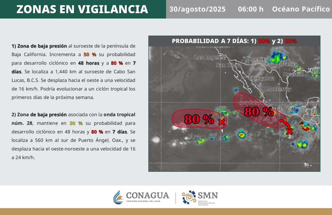 Asimismo, Osuna Tirado añadió que prevalece el monitoreo de dos zonas de baja presión con 80 por ciento de probabilidad ciclónica a siete días, una de ellas con mayor énfasis de vigilancia ya que se mueve paralela a las costas.