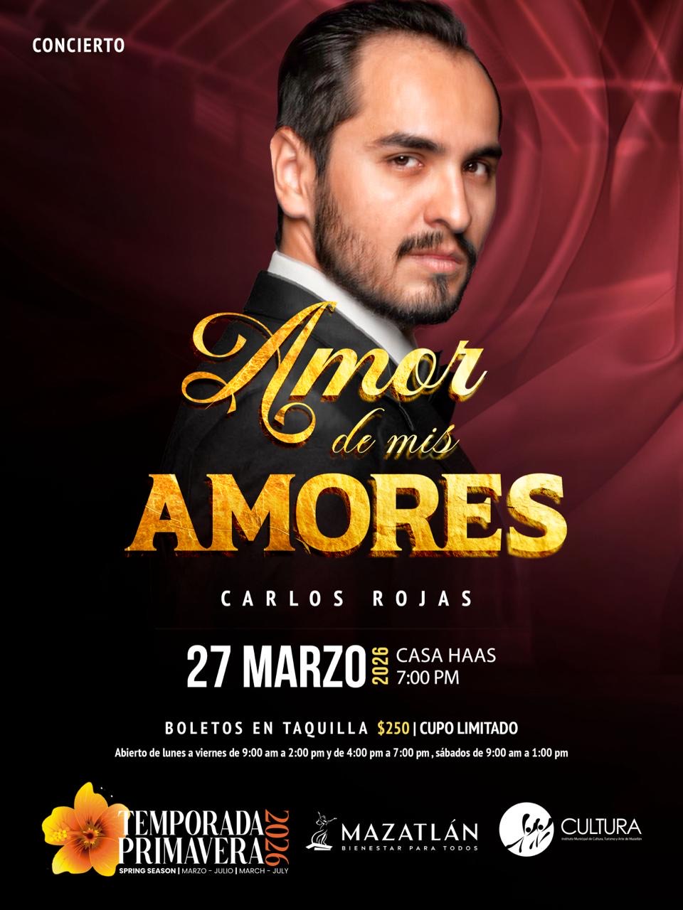 Mazatlán, Sinaloa, 18 de marzo de 2026.– El barítono mazatleco Carlos Rojas, una de las voces más sensibles del panorama lírico actual, regresará al escenario de Casa Haas el próximo viernes 27 de marzo a las 19:00 horas para protagonizar la velada musical “Amor de mis Amores”.