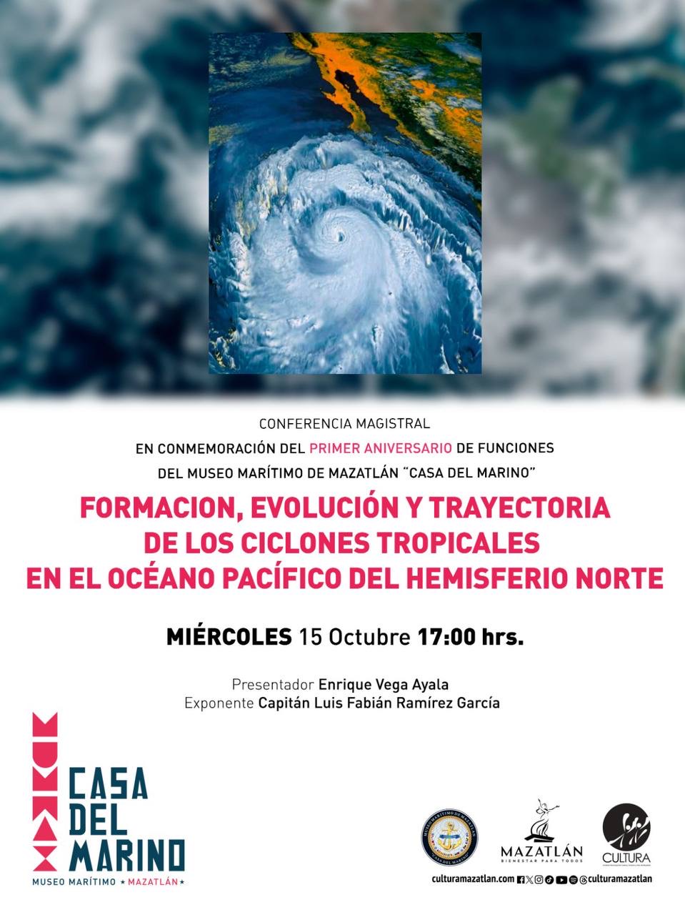 Mazatlán, Sinaloa, 13 de octubre de 2025.— A casi un año de su reinauguración luego de ser sometido a trabajos de rescate y restauración, el Museo “Casa del Marino” conmemorará su primer año de funcionamiento con un evento de gran relevancia: la conferencia magistral “Formación, evolución y trayectoria de los ciclones tropicales en el Océano Pacífico del hemisferio norte”.