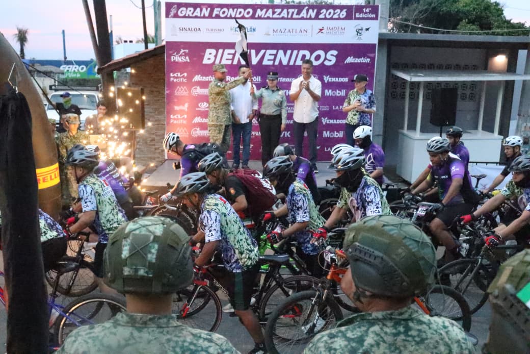 Mazatlán, Sinaloa a 8 de febrero de 2026.- Con El Faro de Mazatlán como punto de partida y en el marco de febrero, Mes del Ejército y Fuerza Aérea, cientos de ciclistas vivieron una experiencia llena de deporte, convivencia y orgullo nacional, en el arranque de la decimocuarta edición del Gran Fondo Mazatlán.