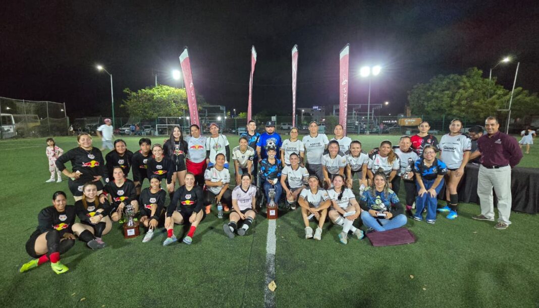 Mazatlán, Sinaloa a 21 de abril de 2026.- La gran final de la Liga de Futbol 7 Nocturna Femenil, realizada en la cancha de la colonia Burócrata con el apoyo del Gobierno de Mazatlán, que lidera la Presidenta Municipal, Estrella Palacios Domínguez, resultó un partido de un solo lado con la victoria 4-2 de Prefabricadas Xomir, sobre la escuadra Sirenas.