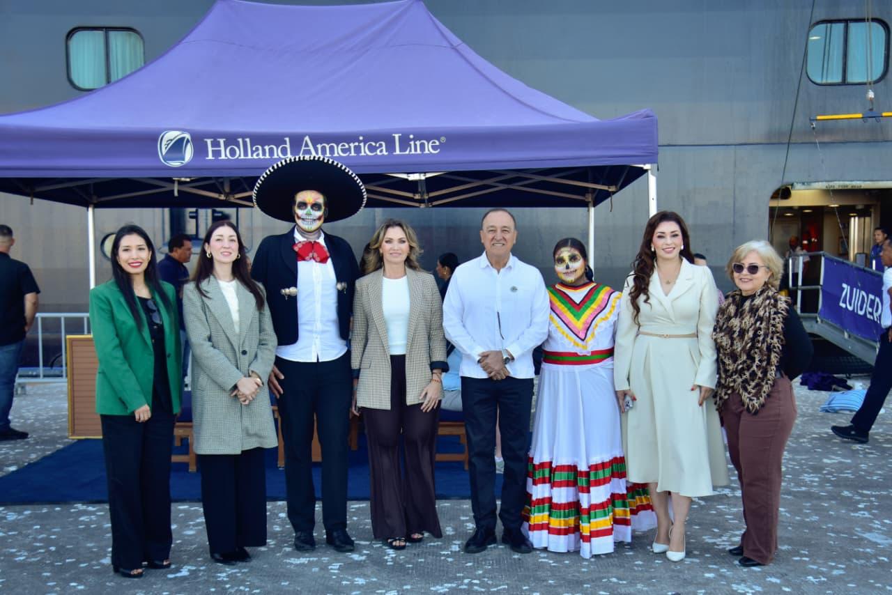 Los Mochis, Ahome, Sinaloa, México. A 21 de febrero de 2026.- Con música sinaloense, ballet folclórico, corredor turístico y una muestra de la hospitalidad local, el Gobierno de Ahome recibió en Topolobampo al crucero Zuiderdam, de la naviera Holland America Line, en un acto protocolario encabezado por el Presidente Municipal Antonio Menéndez de Llano Bermúdez.