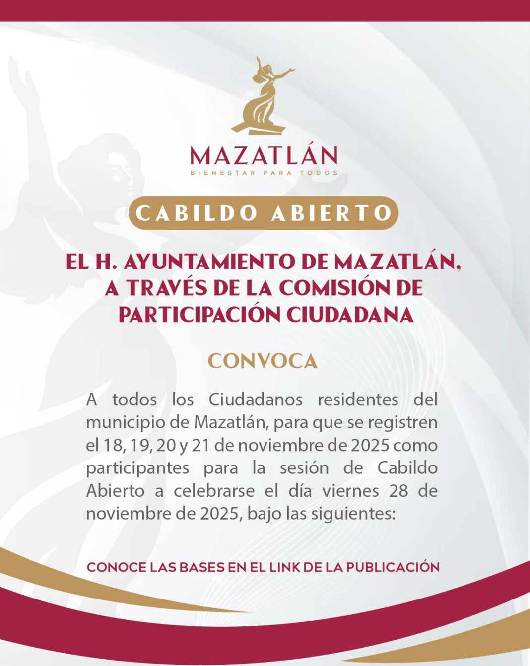 Mazatlán, Sinaloa, 18 de noviembre de 2025.– El Gobierno Municipal de Mazatlán, encabezado por la Presidenta Estrella Palacios Domínguez, lanzó una invitación abierta a todas y todos los mazatlecos para participar en la próxima sesión de Cabildo Abierto. Este ejercicio democrático busca continuar fortaleciendo los canales de comunicación directa entre la población y las autoridades municipales.