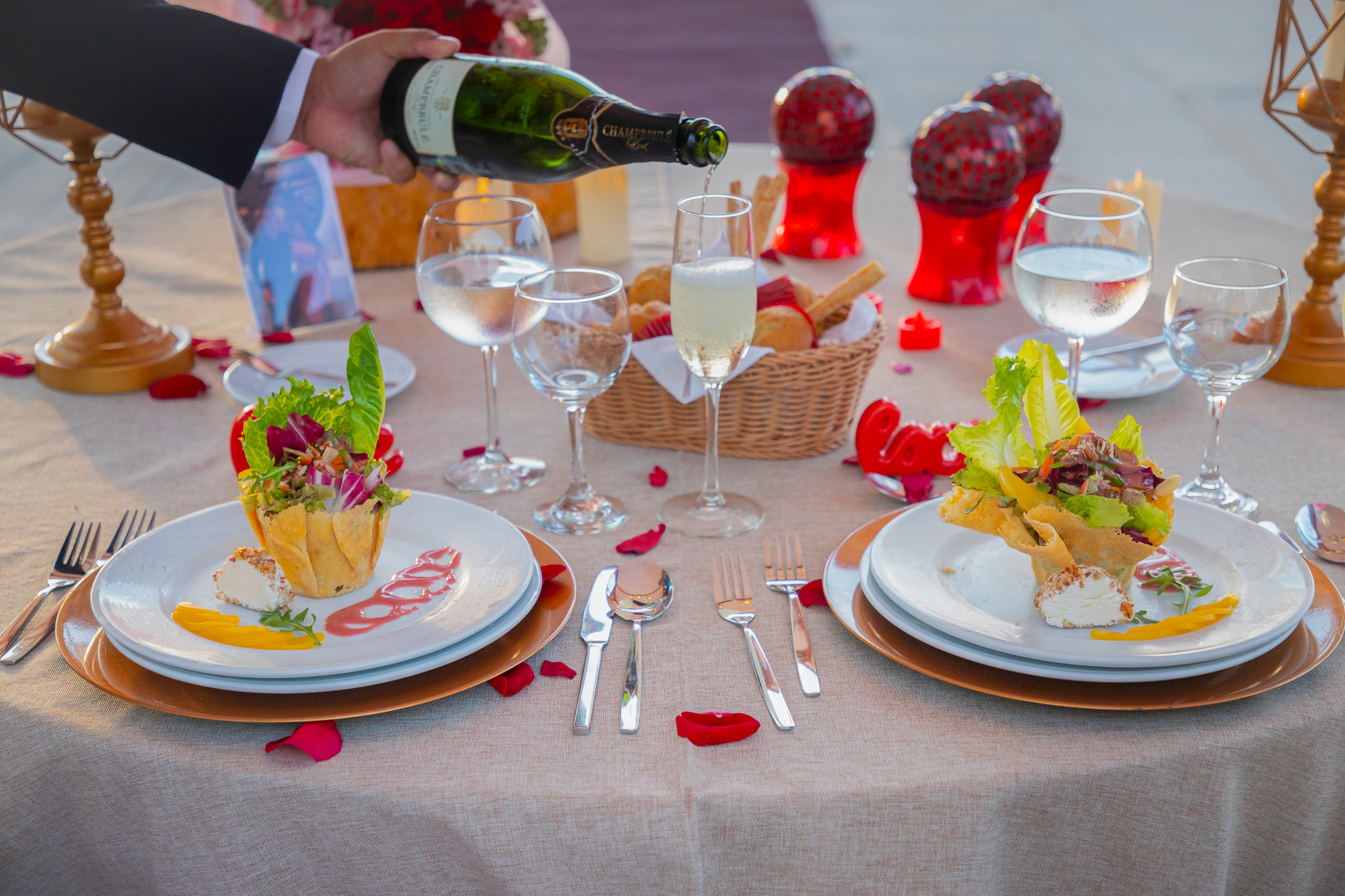 La propuesta gastronómica se acompaña de una botella de champagne, vino tinto o espumoso, así como bebidas nacionales incluidas, además de la posibilidad de personalizar la velada con un mensaje especial presentado en el plato del postre, ideal para celebraciones significativas o propuestas de matrimonio.