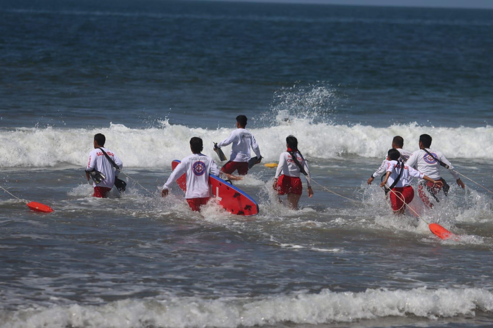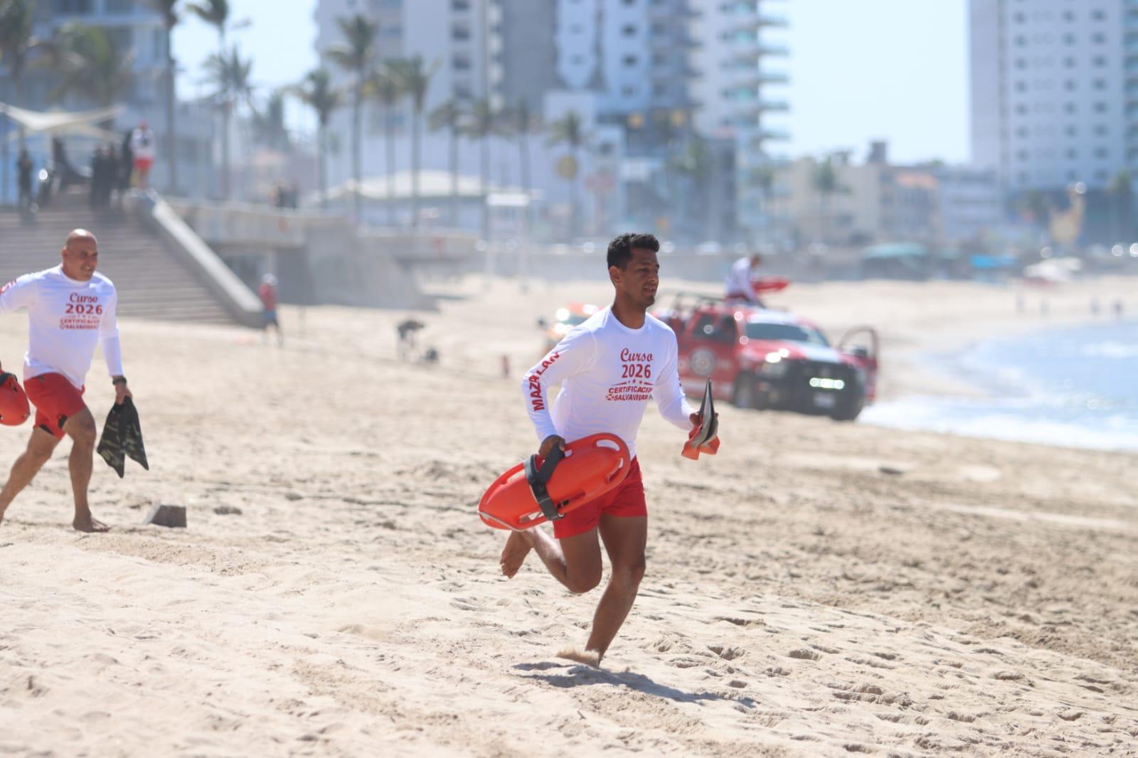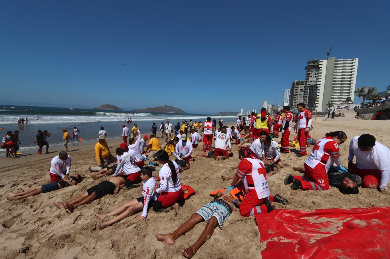 Mazatlán, Sinaloa, 25 de marzo de 2026.– En un macrosimulacro coordinado entre los elementos del Escuadrón de Salvamento Acuático, cuerpos de emergencia y Protección Civil, se dio por concluido un curso de certificación en el que 130 elementos salvavidas se certificaron y actualizaron en técnicas de rescate, quienes se sumarán a la coordinación operativa que se mantendrá activa durante el periodo vacacional de Semana Santa, que inicia el próximo 29 de marzo.