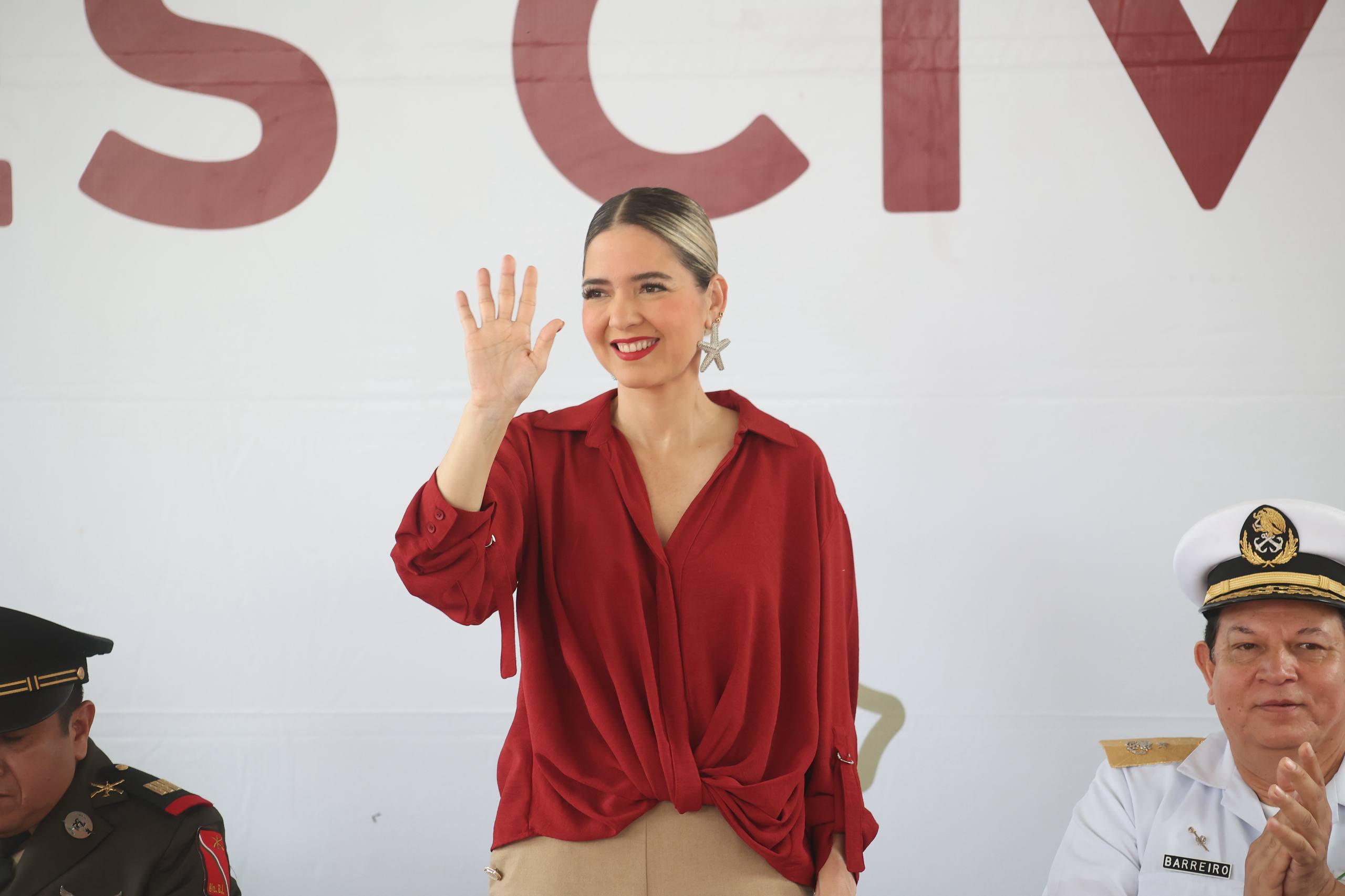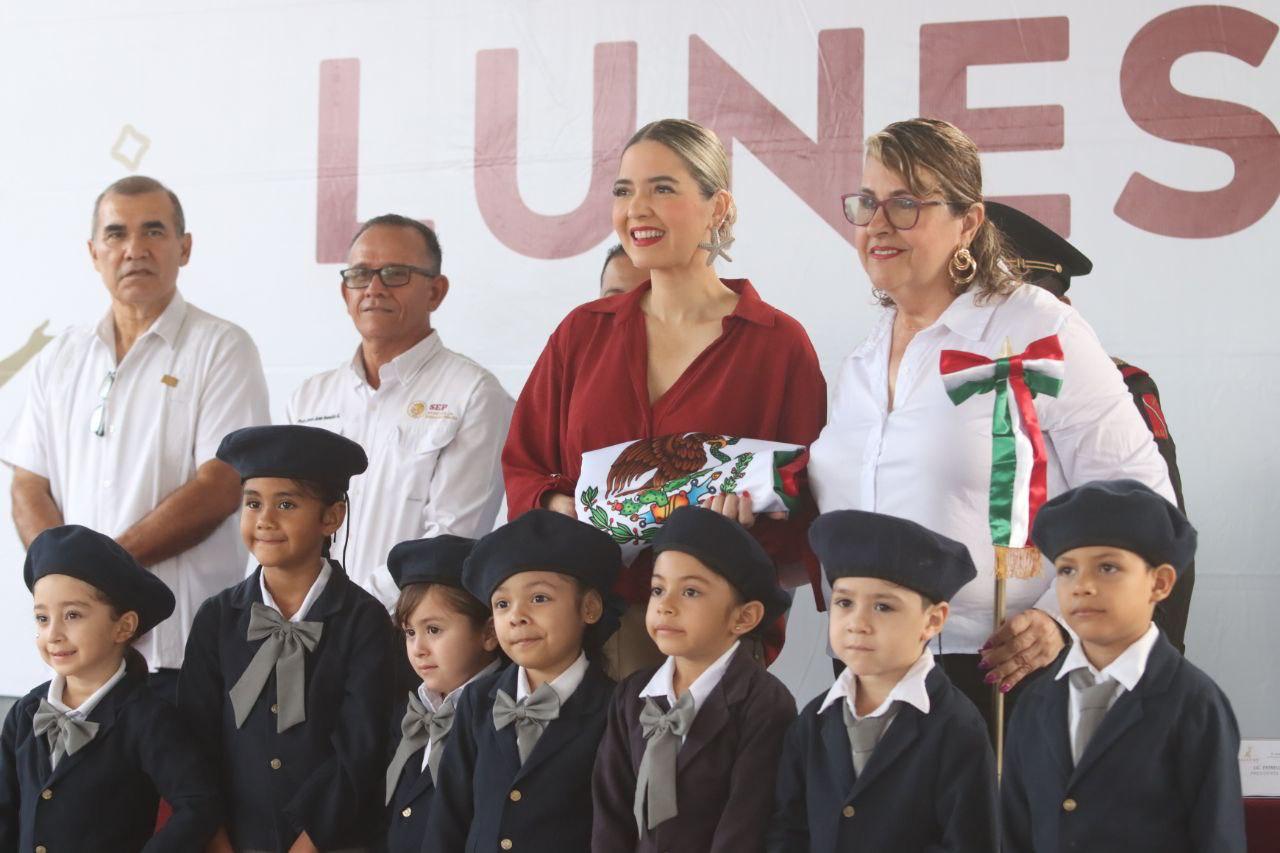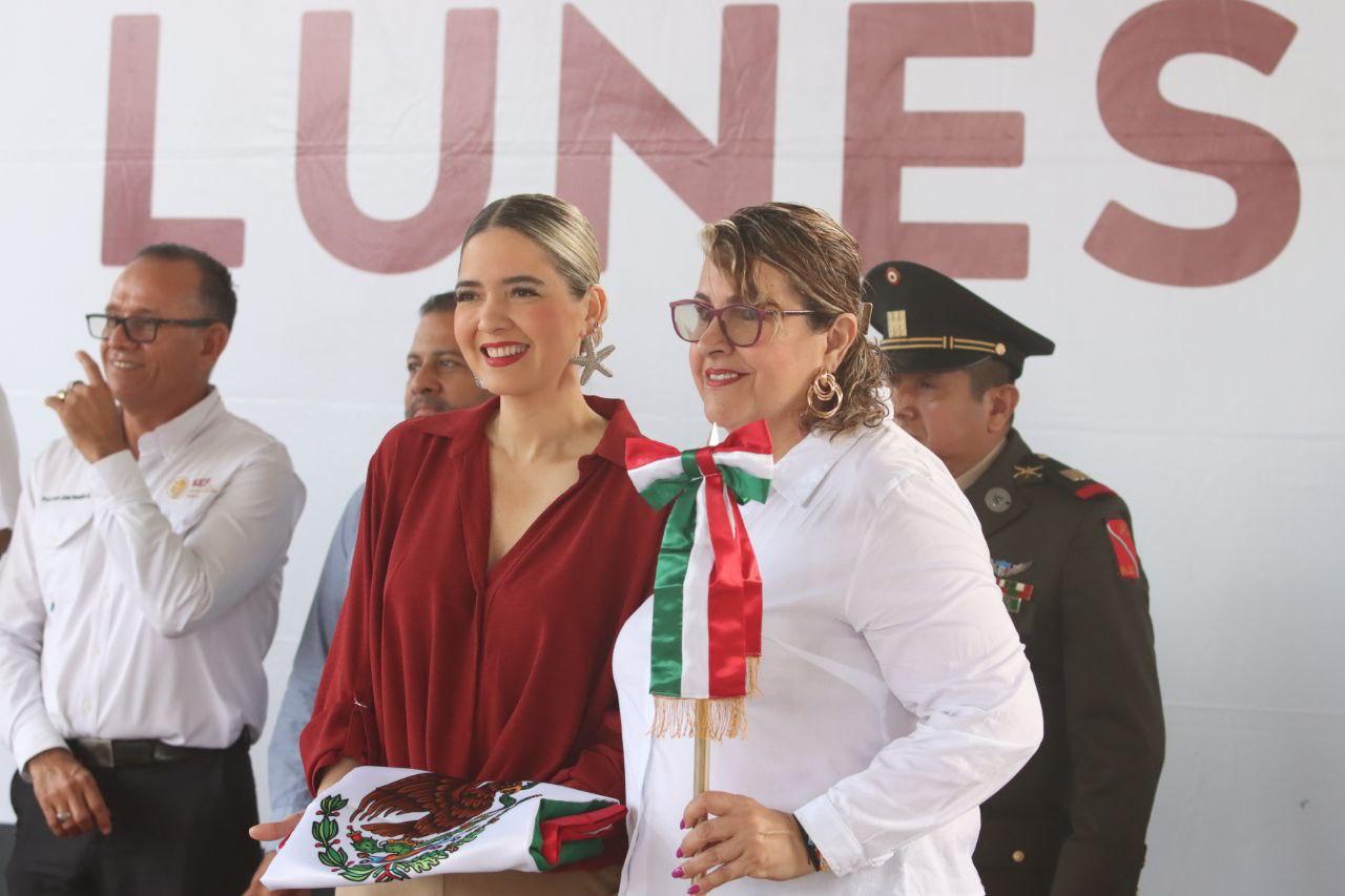 Durante el acto cívico, se realizaron honores a la bandera y se entonó el Himno Nacional Mexicano. Asimismo, Estrella Palacios hizo entrega de una bandera con su asta, material deportivo y diplomas a estudiantes destacados.