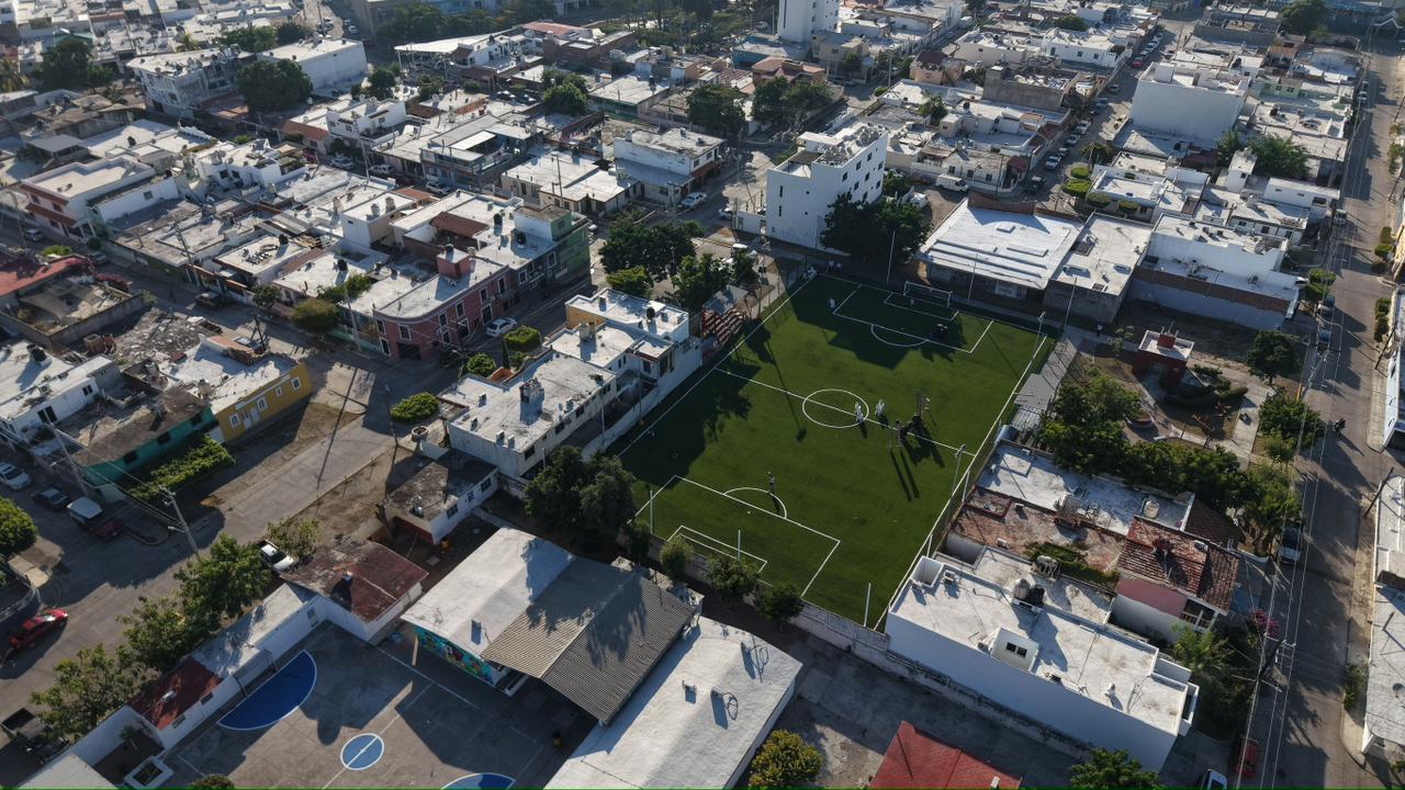 La obra, que significó una inversión de 881 mil 997 pesos, consistió en el reempastado de la cancha, la renovación de la reja perimetral, las mallas de contención y sus redes, así como la rehabilitación de los baños y el mantenimiento preventivo de los juegos infantiles de la zona.