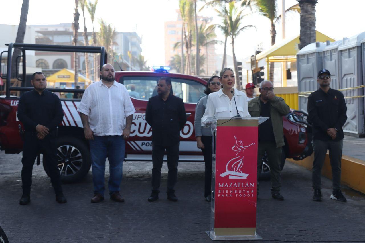 Mazatlán, Sinaloa, 13 de febrero de 2026.— En el marco del operativo preventivo por las fiestas del Carnaval de Mazatlán 2026, la Presidenta Municipal, Estrella Palacios Domínguez, hizo entrega de nuevas unidades preventivas y equipo táctico a la Secretaría de Seguridad Pública Municipal y a la Unidad de Tránsito, con una inversión de 19.6 millones de pesos.