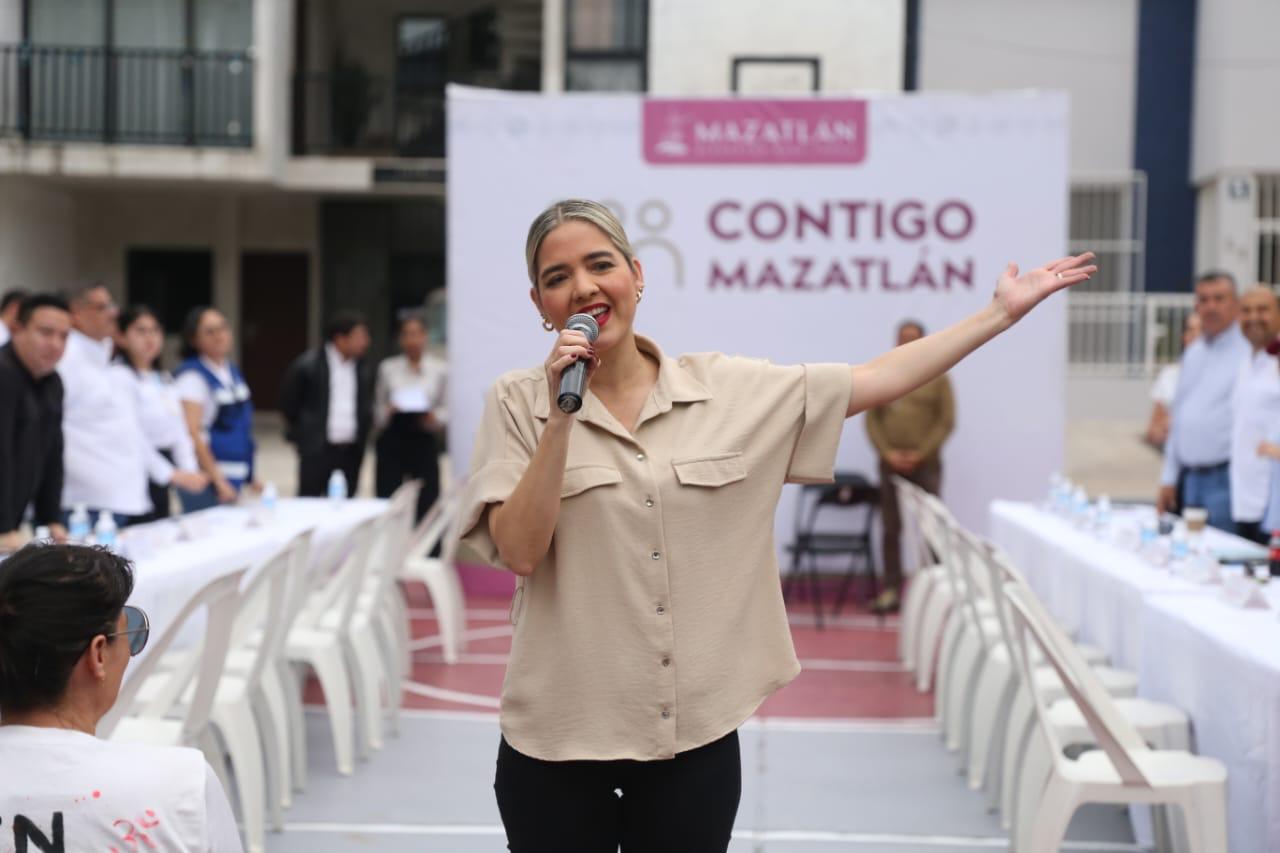 Mazatlán, Sinaloa, 3 de diciembre de 2025.– Con el propósito de reforzar la cercanía entre el Gobierno Municipal y la ciudadanía, la Presidenta Estrella Palacios Domínguez encabezó la jornada de atención ciudadana “Contigo Mazatlán”, realizada la tarde de este miércoles en la cancha de basquetbol de la colonia López Mateos.
