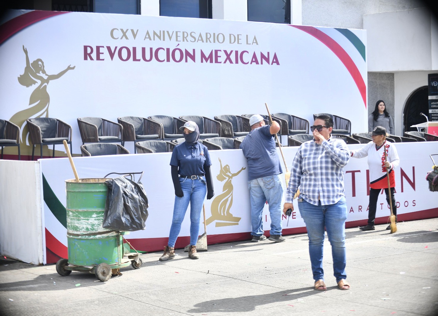 El Departamento de Aseo Urbano realizó barrido manual, limpieza de banquetas, retiro de basura, lavado de áreas de alta afluencia, así como poda y embellecimiento de camellones en el tramo del desfile. Estas acciones permitieron ofrecer un espacio ordenado y seguro antes del inicio del contingente cívico-militar-deportivo.