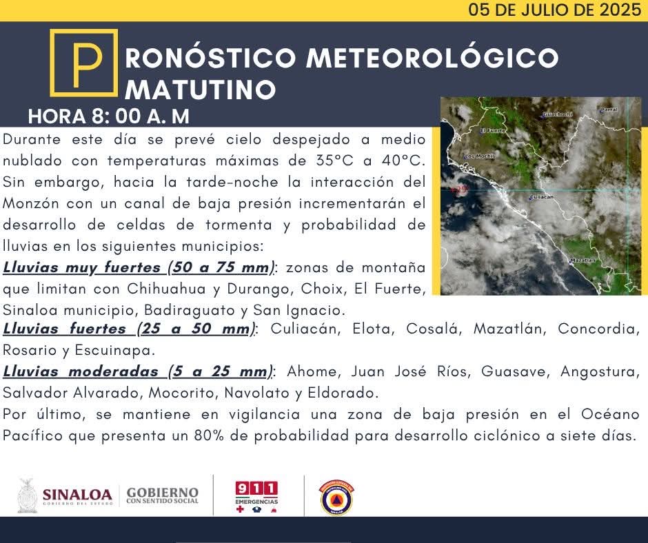 Mazatlán, Sinaloa, 5 de julio de 2025.– Cielo nublado, con temperaturas de 35 a 40 grados centígrados, se presentarán durante parte del sábado en Mazatlán, con probabilidad de incremento de lluvias durante la tarde-noche, informó la Coordinación Municipal de Protección Civil.