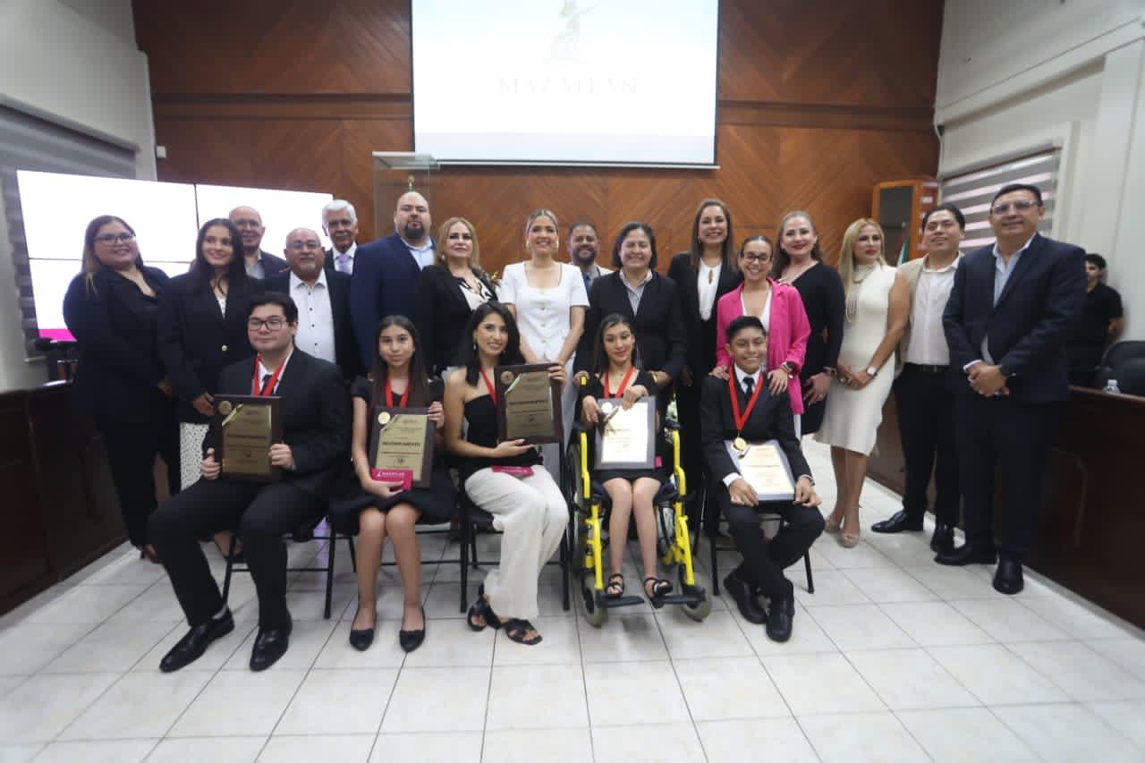 Acompañada por integrantes del Cabildo, la Directora del IMJU, Arantxa Fernanda Ahumada Rosas, así como familiares y amigos de las y los homenajeados, la Presidenta Municipal enfatizó que las y los homenajeados reflejan lo que es la sociedad: jóvenes que estudian, crean, ayudan, inspiran y trabajan por un mejor Mazatlán.