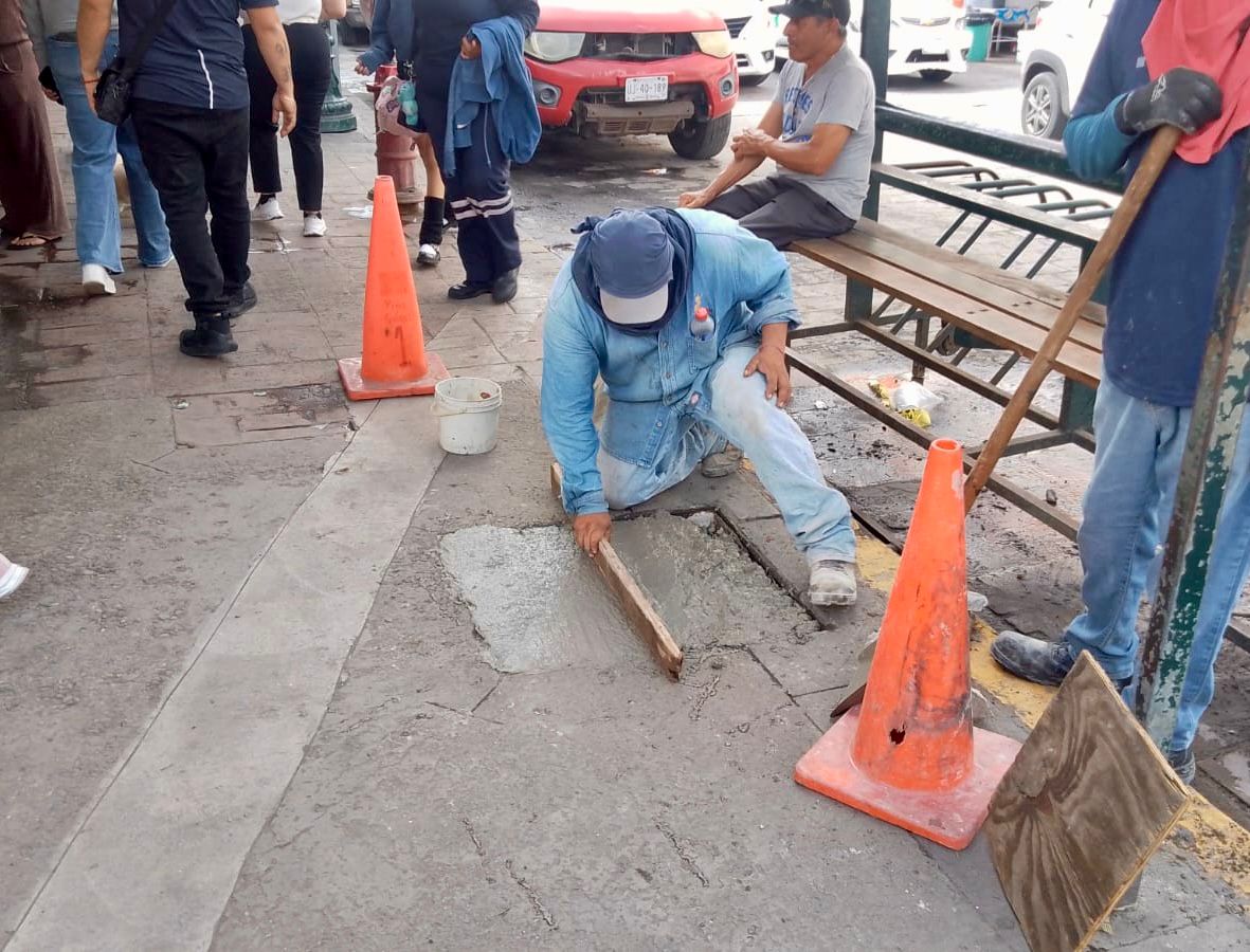 Las labores consisten en la reparación de tapas y registros en banquetas y calles aledañas al llamado “Gigante de Hierro”, atendiendo puntos que presentaban deterioro y que requerían intervención para prevenir riesgos y mejorar la imagen urbana del área.
