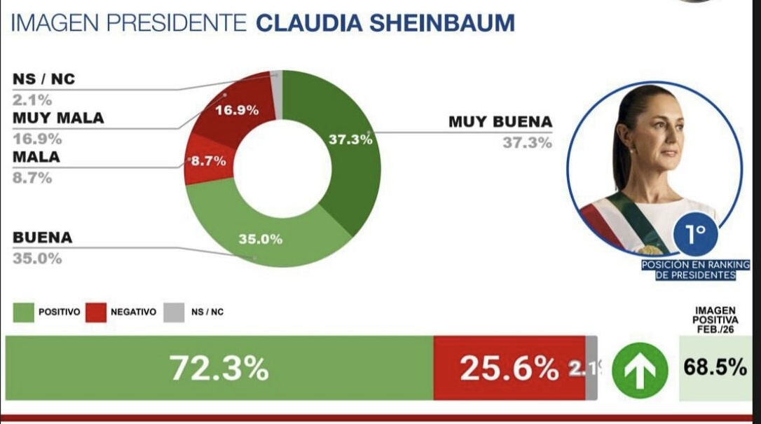 Claudia Sheinbaum Pardo, encabeza el ranking de los presidentes de Latinoamérica presentado por la CB Global Data, siendo la presidenta mejor valorada por sus ciudadanos en la lista de marzo de 2026.
