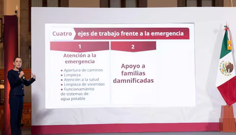 Al afirmar que la emergencia de los daños causados por las lluvias en cinco estados de la República «aún no termina», la presidenta Claudia Sheinbaum Pardo informó los cuatro ejes de trabajo para ayudar a los damnificados: