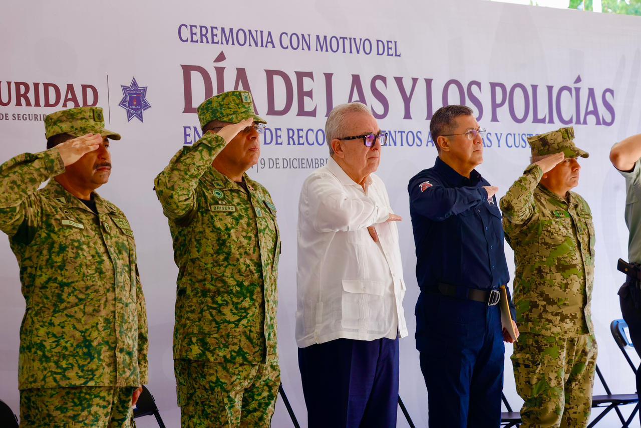 Acompañaron al Gobernador en esta celebración, Acompañaron al Gobernador Rocha, Guillermo Briseño Lobera, comandante de la Tercera Región Militar; José Daniel Reséndiz Sandoval, comandante de la Cuarta Región Naval; Santos Gerardo Soto, comandante de la Novena Zona Militar, Julices Julián González, coordinador estatal de la Guardia Nacional; Yeraldine Bonilla Valverde, secretaria General de Gobierno; Juan de Dios Gámez, alcalde de Culiacán; Víctor Luis Soto, encargado de despacho de la Fiscalía General de la República; Claudia Zulema Sánchez, Fiscal General del Estado; comandante de la Base Aérea Militar n10 Jesús Manuel Castro; así como elementos de las distintas corporaciones de seguridad, militares, cadetes de la Universidad del Policía y familiares de los elementos.