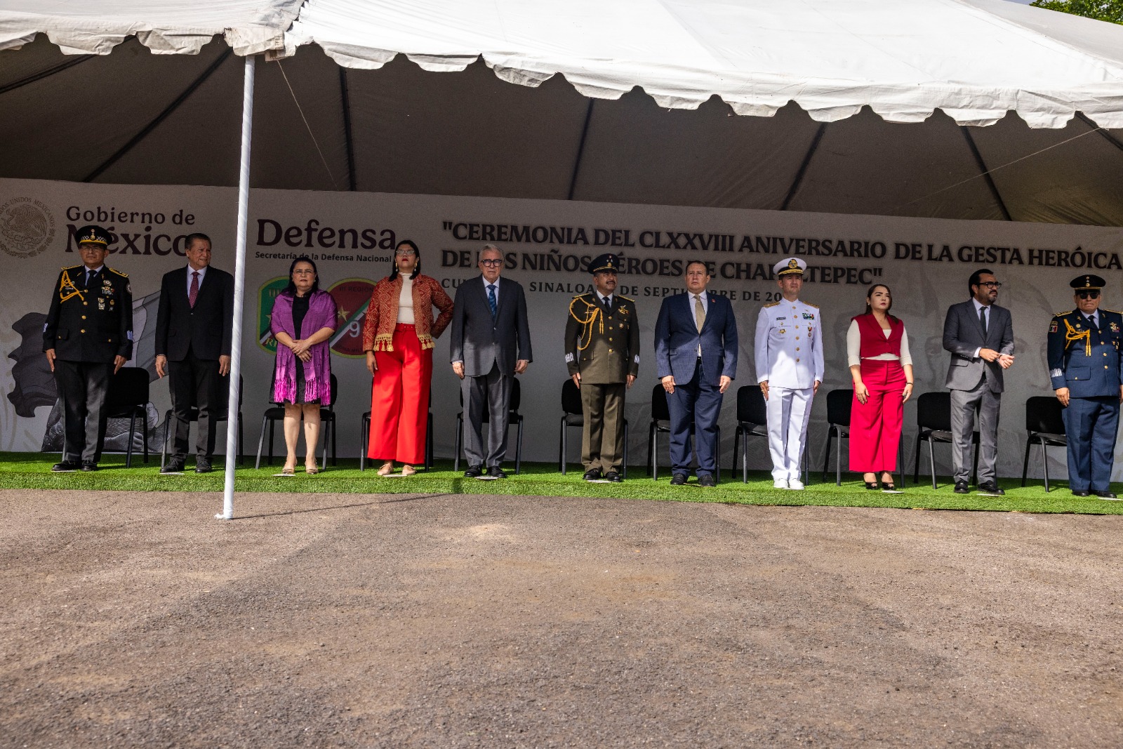 La ceremonia del 178 aniversario de la gesta heroica de los Niños Héroes de Chapultepec estuvo encabezada por el gobernador Rubén Rocha Moya, el comandante de la Novena Zona Militar, Santos Gerardo Soto, magistrado Jesús Iván Chávez Rangel, presidente del Poder Judicial, la Diputada Estefani Rea Reátiga, en representación de la diputada presidente de la Mesa Directiva del Congreso del Estado, Yeraldine Bonilla, Vicealmirante Saul Vidal en representación DEL comandante de la Cuarta Zona Naval, José Reséndiz Sandoval, Maestra Claudia Zulema Sánchez Kondo, Fiscal General del Estado y el alcalde de Culiacán, Juan de Dios Gámez Mendívil.