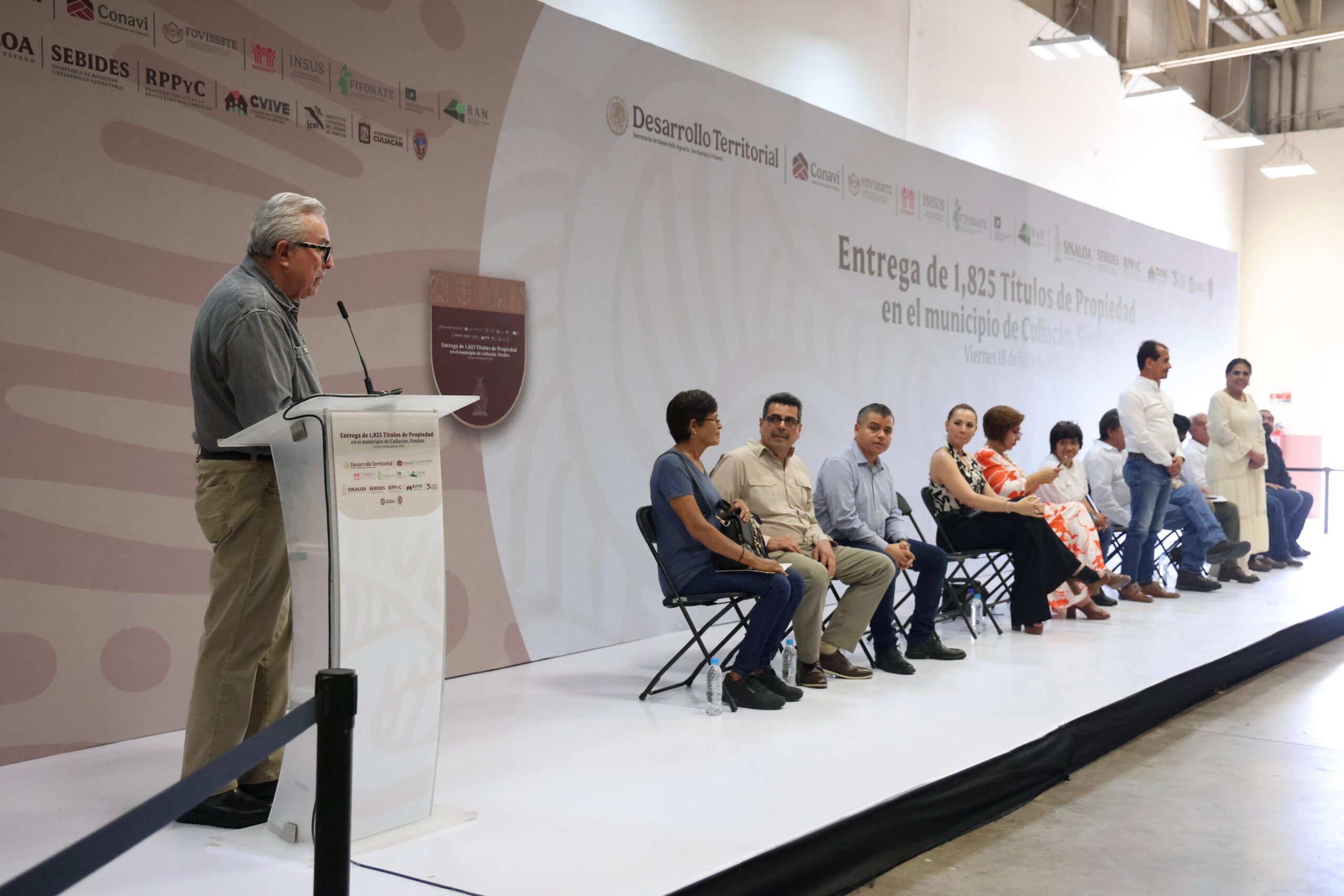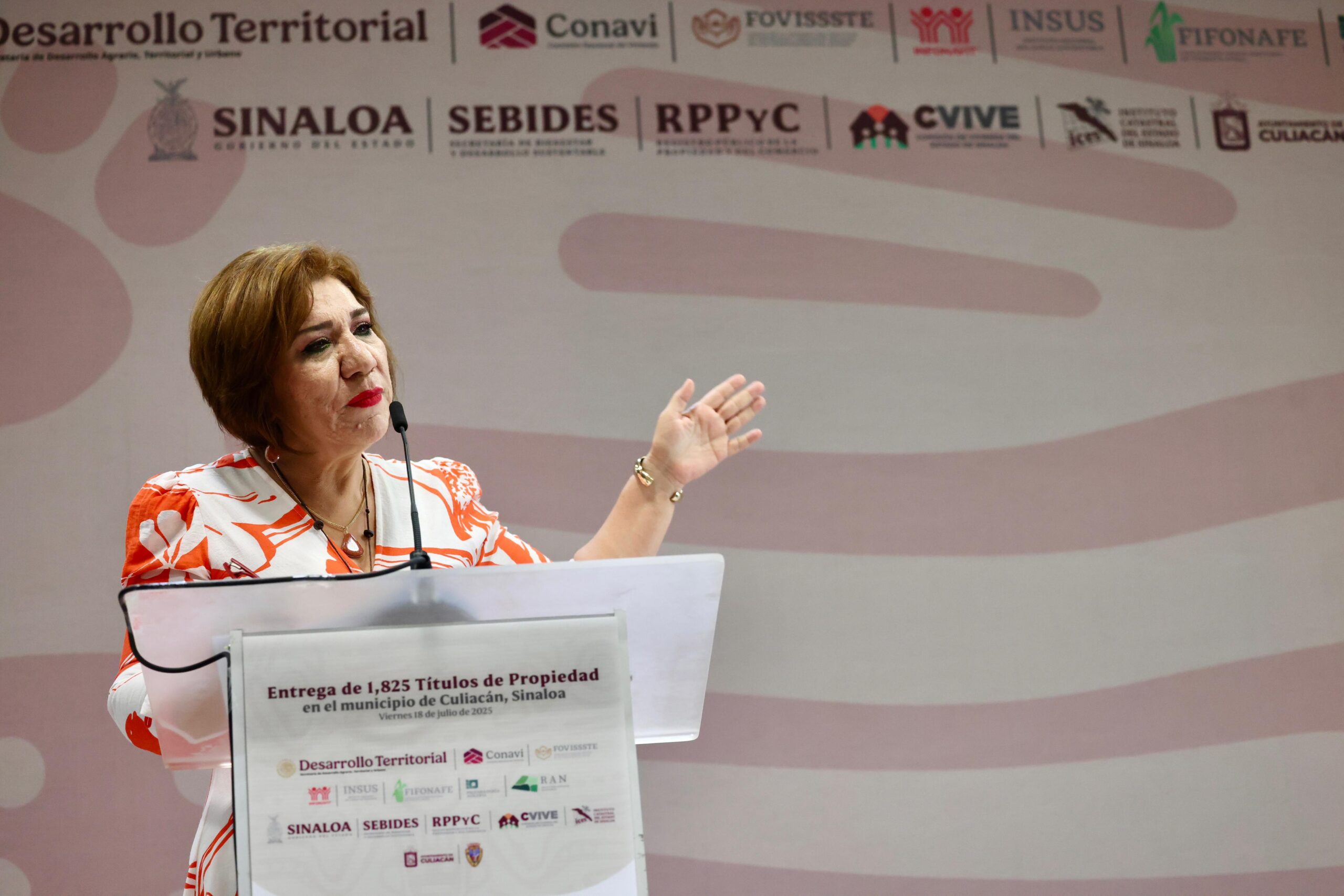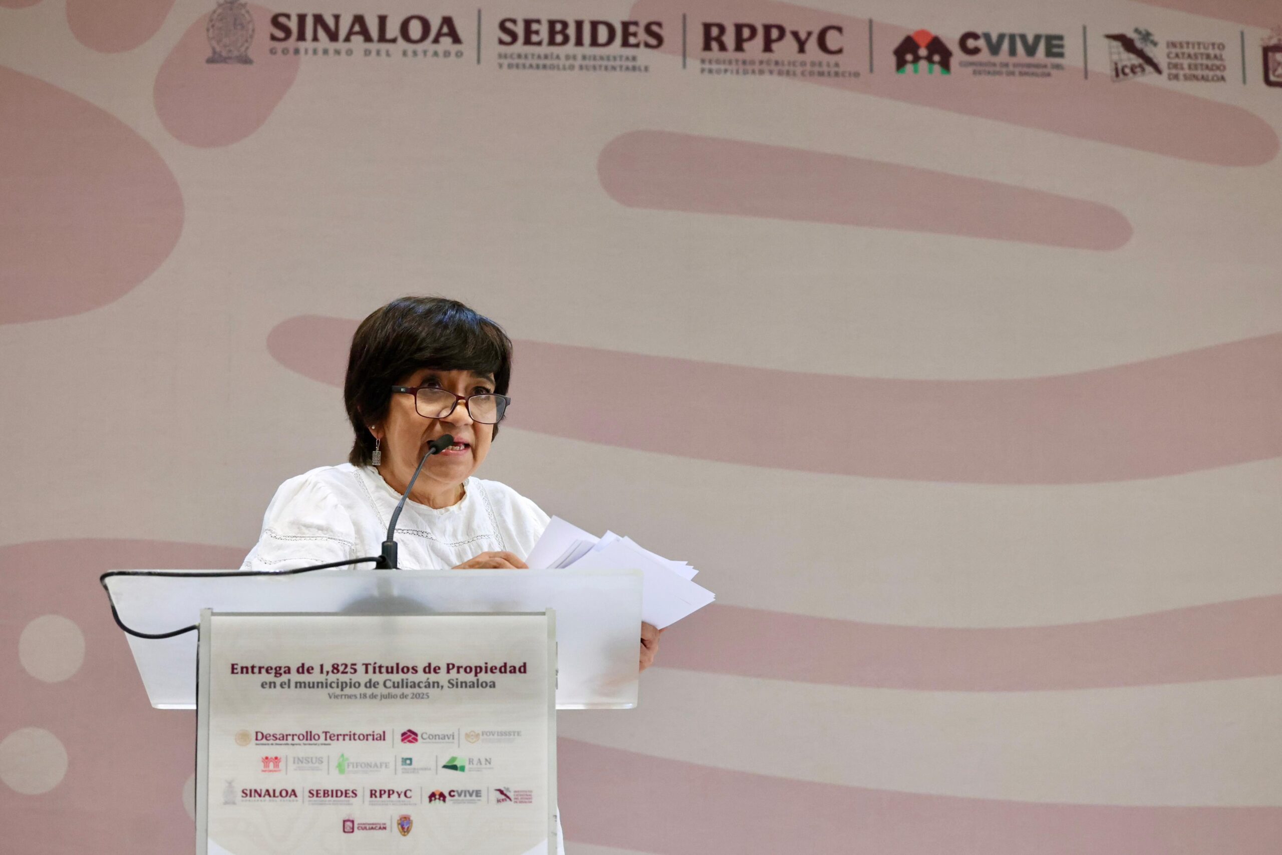 La titular de SEDATU destacó que en la presente administración, de octubre del año pasado a junio de este año, solo en el estado de Sinaloa se han entregado 6 mil 937 documentos que acreditan la propiedad por parte del Registro Agrario Nacional, otorgando certeza jurídica sobre las propiedades de las familias.
