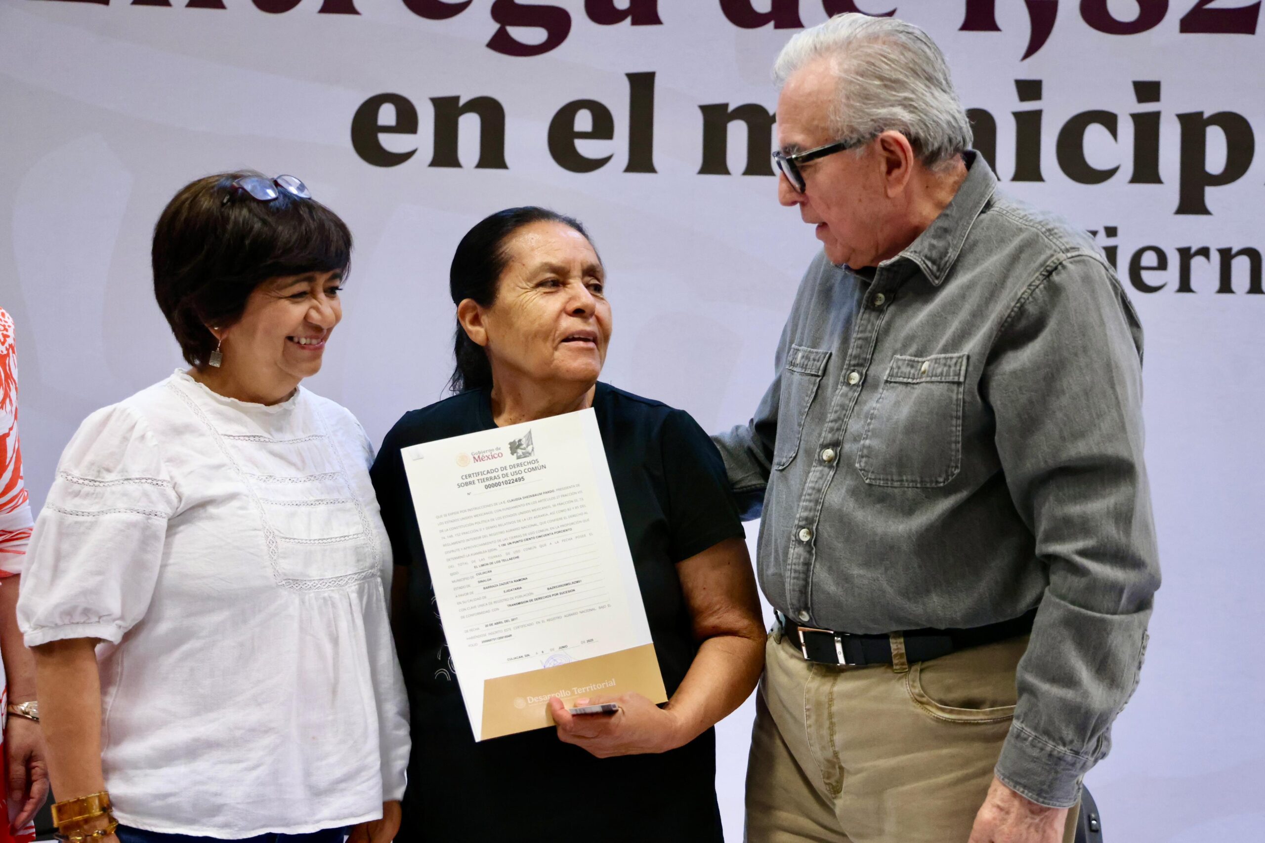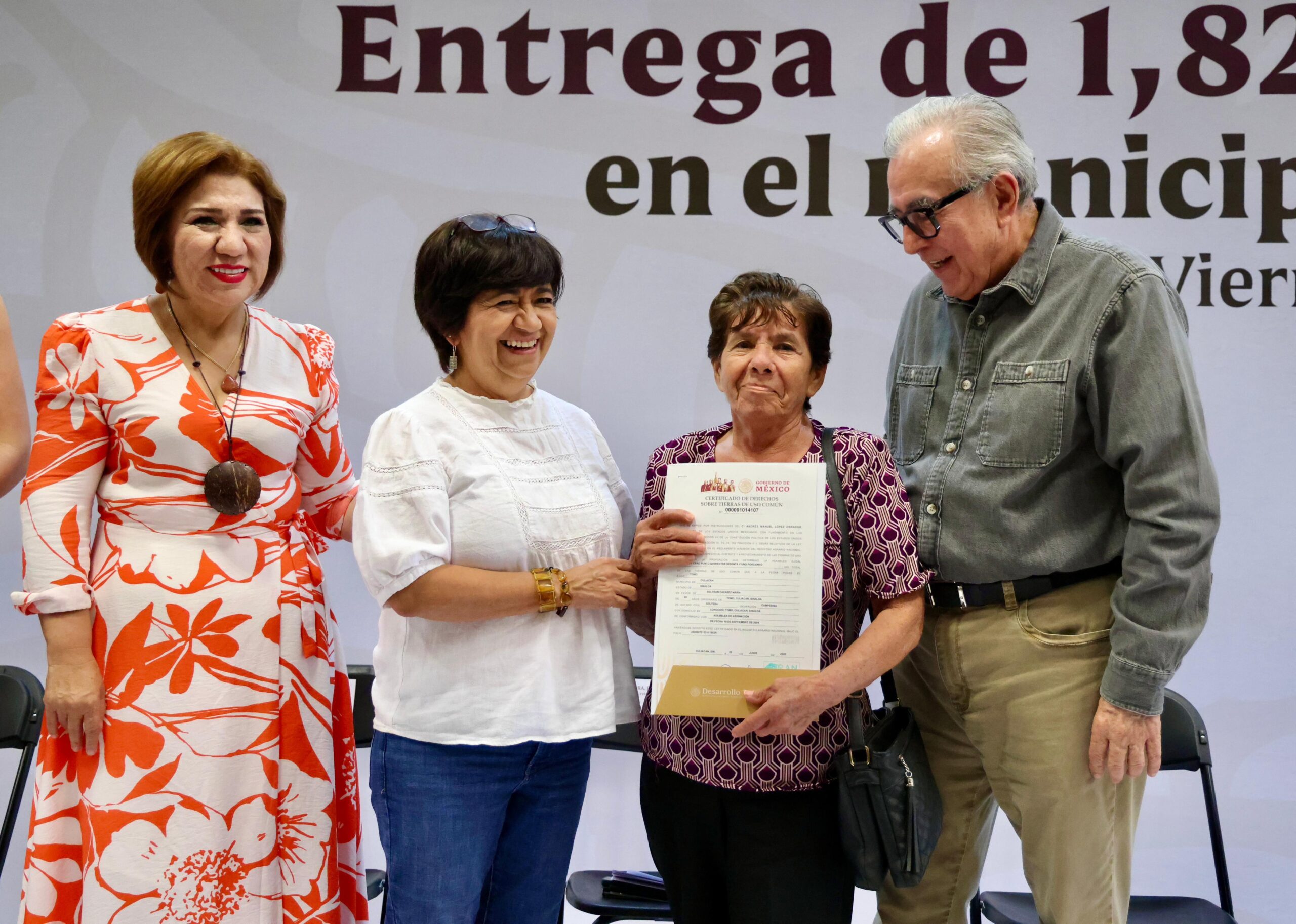En su intervención, la secretaria Vega Rangel señaló que la entrega de estos títulos de propiedad es el resultado de la suma de esfuerzos de los tres niveles: del gobierno federal a través de la Procuraduría Agraria, del Registro Agrario Nacional, y del Instituto Nacional de Suelo Sustentable bajo la coordinación de la SEDATU, pero también del gobierno estatal, con las dependencias ya mencionadas, y es producto del gran trabajo que ha encabezado la secretaria de Bienestar, María Inés Pérez Corral, a quien le hizo un público reconocimiento.