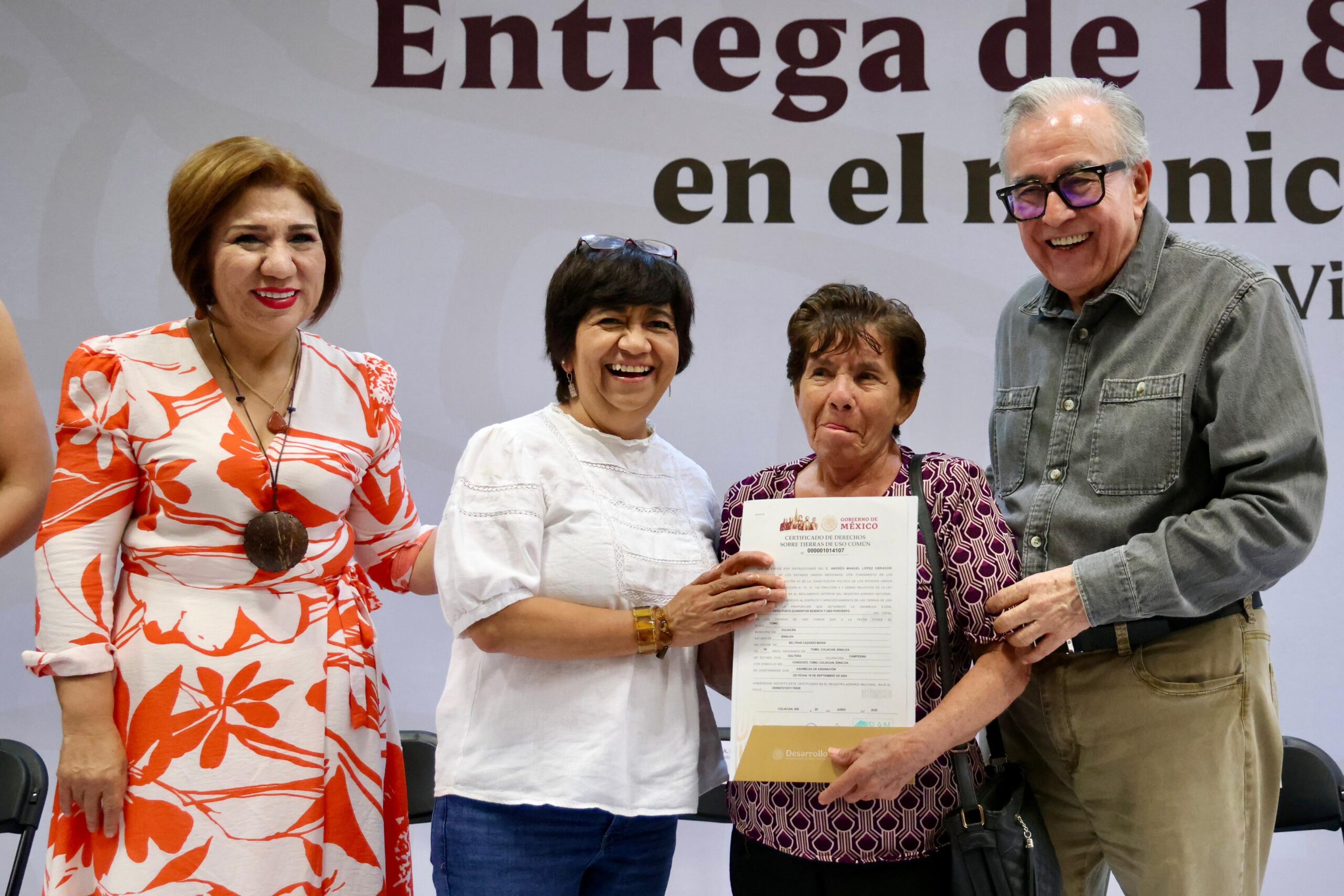 En su mensaje a las familias beneficiadas, el mandatario estatal les dijo que este documento representa certeza jurídica de su patrimonio, es decir, que es de su propiedad y nadie vendrá a quitárselos. “Ya saben qué significa eso, significa patrimonio con la certificación legal, se llama certeza jurídica. Es de ustedes, que nadie les diga que les falta algo. No. Que nadie les diga, oye, préstame, te voy a completar yo. No, señor, a nadie. Eso ya lleva los sellos y las firmas de todos”, dijo.