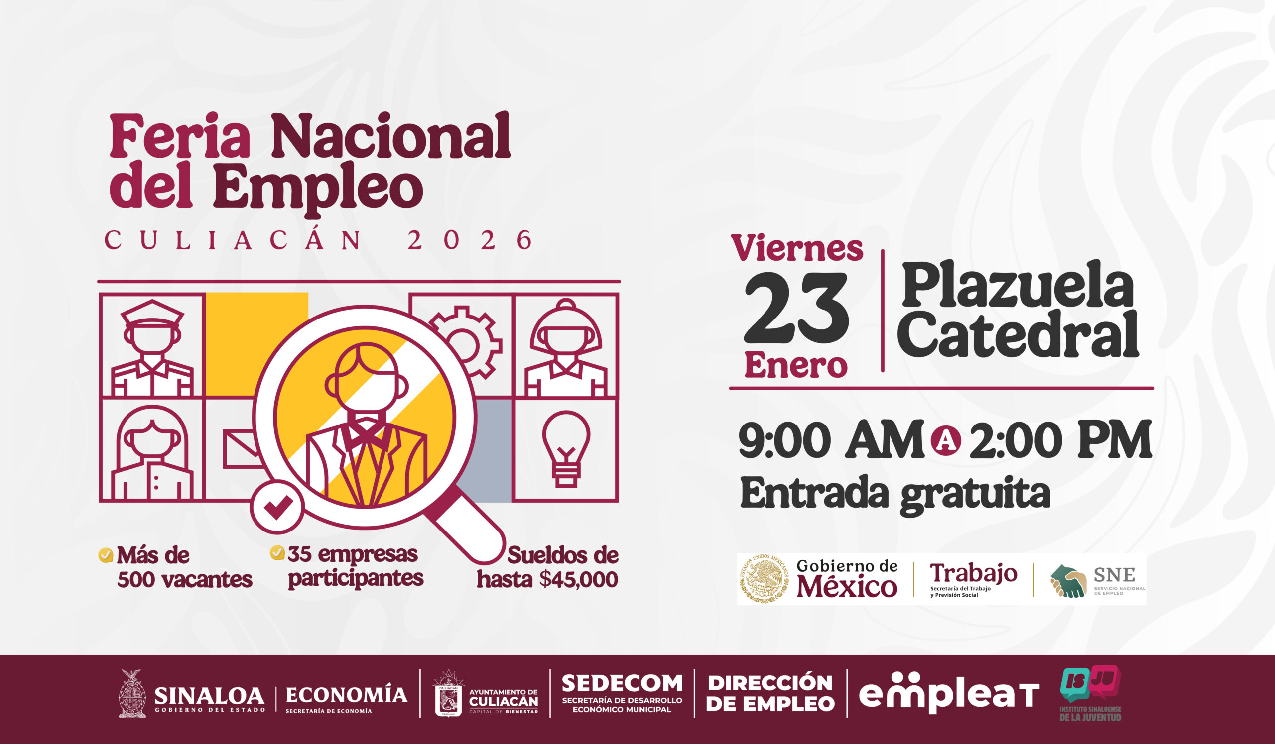 Finalmente, se reiteró la invitación a la ciudadanía a asistir a la primera Feria Nacional del Empleo Culiacán 2026, este viernes 23 de enero, en la plazuela Obregón, en un horario de 9:00 a.m. a 2:00 p.m., donde podrán conocer de manera directa las vacantes disponibles y acceder a diversas opciones para su desarrollo laboral.