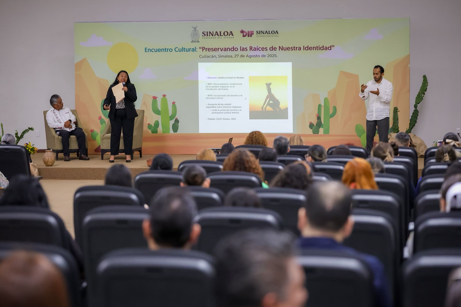 El evento concluyó con un conversatorio en el que participaron destacadas personalidades como la Lic. Celia Gastélum, el artesano yoreme Benjamín Padilla, el intérprete y promotor comunitario M.C. Marcelino Gómez, la maestra María Beatriz Gpe. Sauceda Vázquez y Juan Sauceda Leyva, todos representantes activos de distintas comunidades y lenguas indígenas. Cada uno compartió experiencias de vida y la forma en que promueven y preservan sus tradiciones tanto en Sinaloa como en otros estados e incluso países.