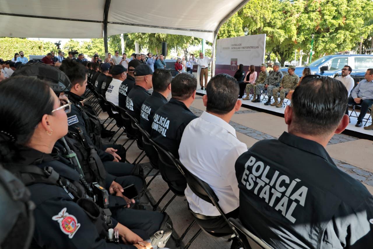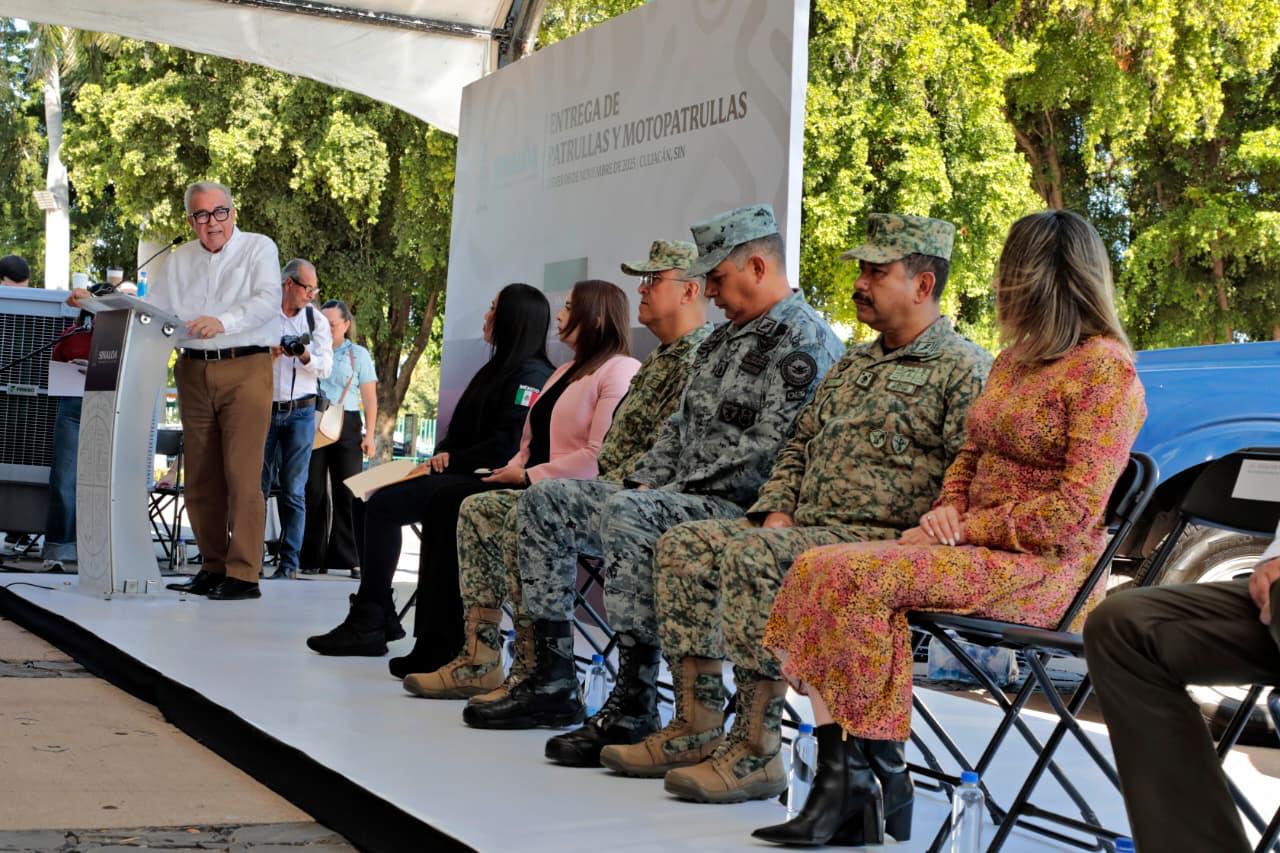 Culiacán, Sinaloa 6 de noviembre de 2025.- Cumpliendo su compromiso de fortalecer la estrategia de paz y seguridad en Sinaloa y a las corporaciones policiacas, el gobernador Rubén Rocha Moya, entregó al secretario de Seguridad Pública Óscar Rentería Schazarino y a los directores de las policías municipales de los 20 Ayuntamientos del estado, 73 patrullas y 7 moto patrullas, con la finalidad de dotar de mejores herramientas de trabajo a las y los elementos.