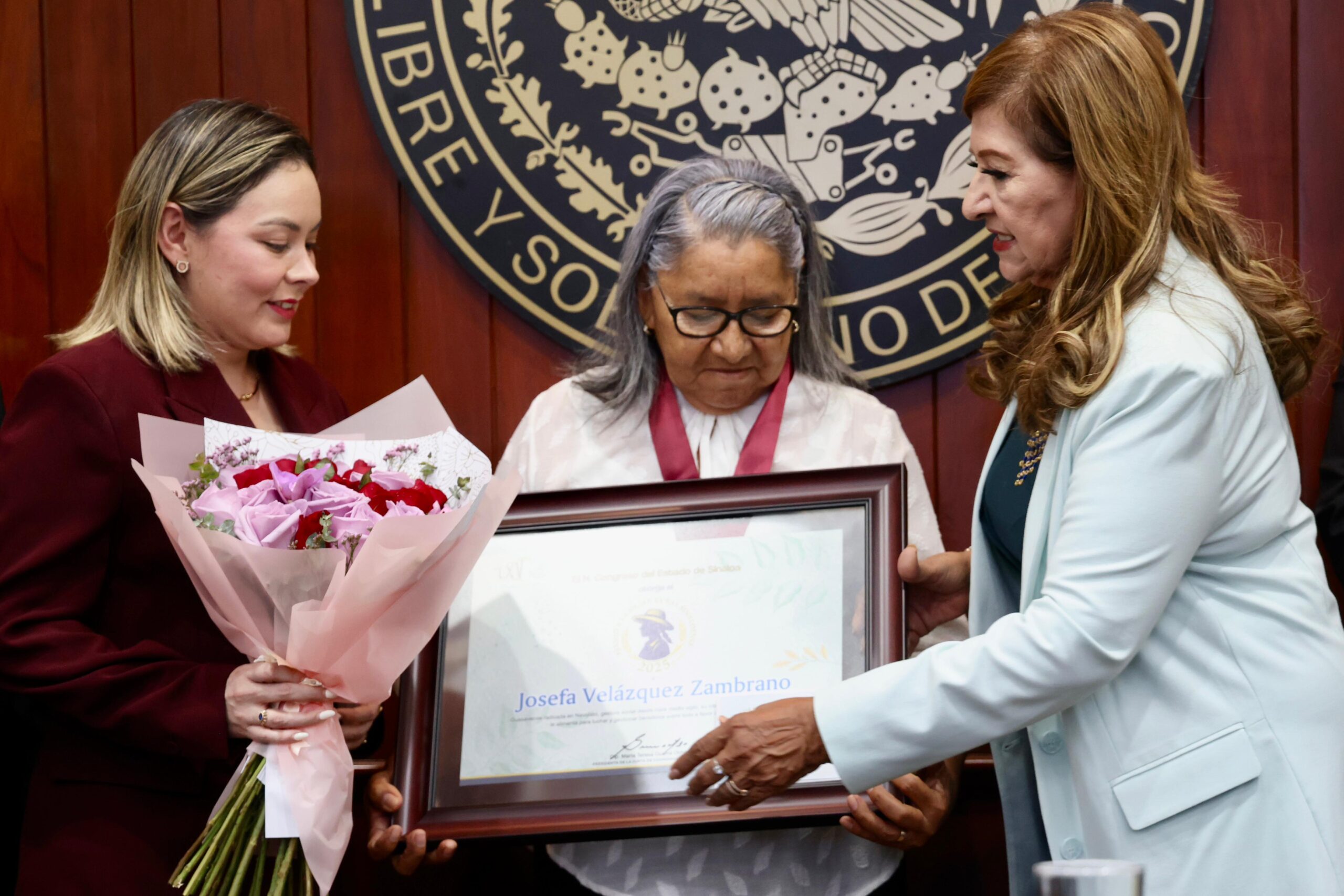La secretaria Bonilla entregó junto con el presidente de la Mesa Directiva de la LXV Legislatura, el diputado Rodolfo Valenzuela Sánchez y la presidenta de la Junta de Coordinación Política, diputada María Teresa Guerra Ochoa, el reconocimiento, medalla y un estímulo económico a la acreedora de este premio, a la señora Josefa Velázquez, y al hacerlo destacó que al otorgar este reconocimiento el Congreso del Estado no sólo honra a la galardonada, sino a todas las mujeres que con trabajo silencioso sostienen la vida y la esperanza en nuestras comunidades.