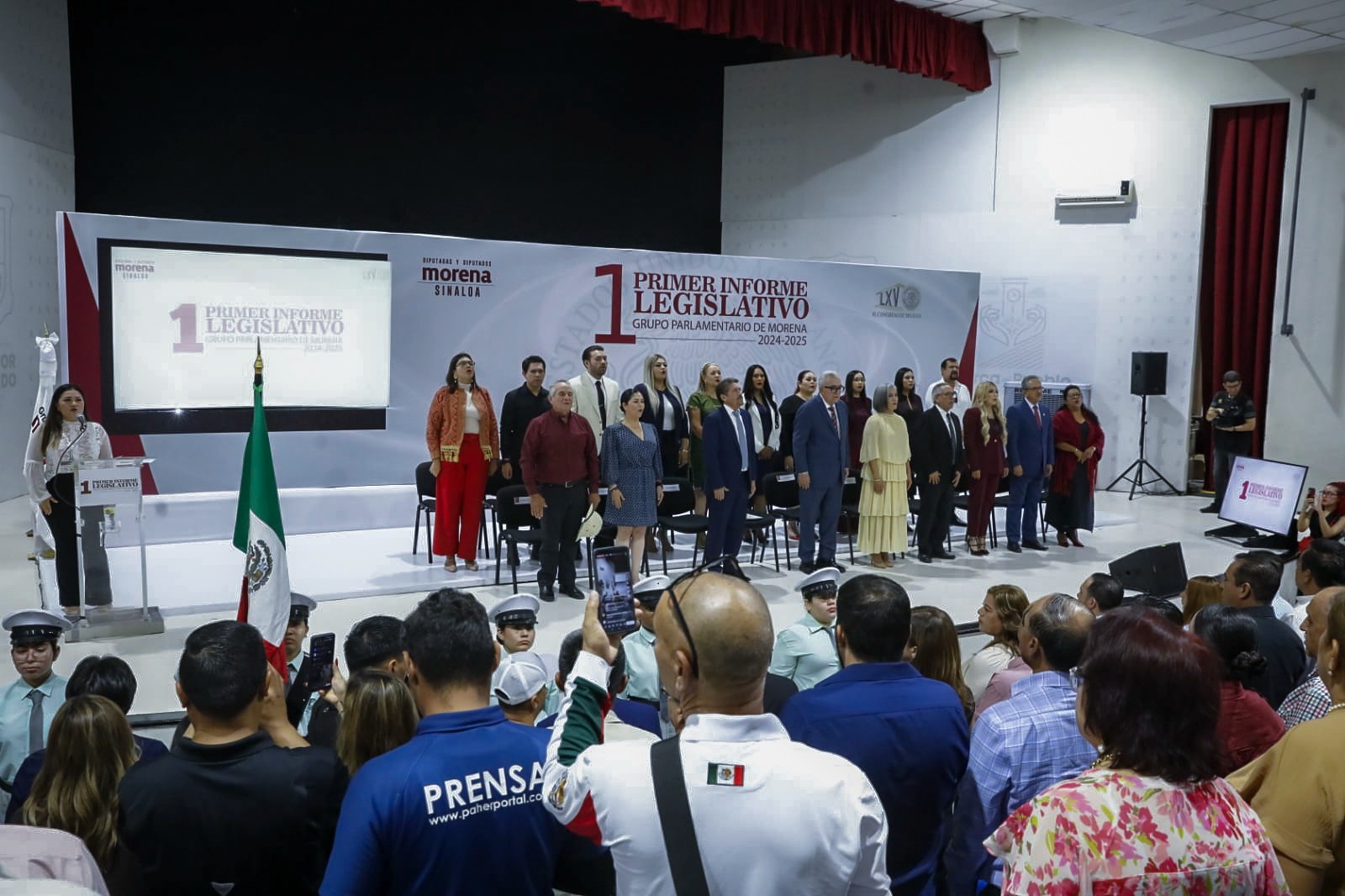 En el Auditorio 27 de Febrero tuvo lugar este informe conjunto al que asistieron 16 diputadas y diputados, encabezados por la presidenta de la Junta de Coordinación Política, Teresa Guerra Ochoa, quien dirigió un mensaje al igual que las diputadas y diputados Luz Verónica Avilés Rochín, Eligio López Portillo y Ambrosio Chávez Chávez, por representar los distritos de la región del Évora.