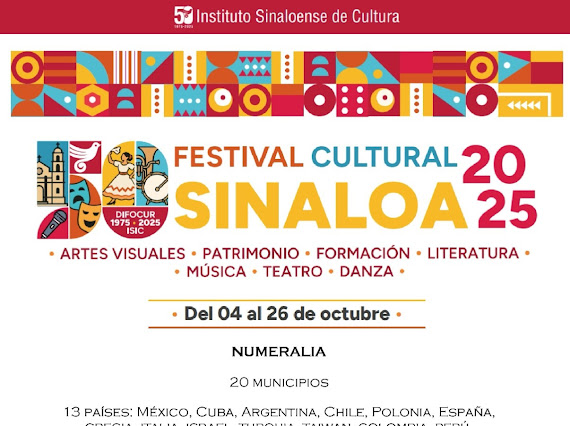 Culiacán, Sinaloa a 02 de Octubre de 2025.- El Gobierno del Estado de Sinaloa a tráves del Instituto Sinaloense de Cultura (ISIC), llevará a cabo el Festival Cultural Sinaloa 2025 del 04 al 26 de octubre.
