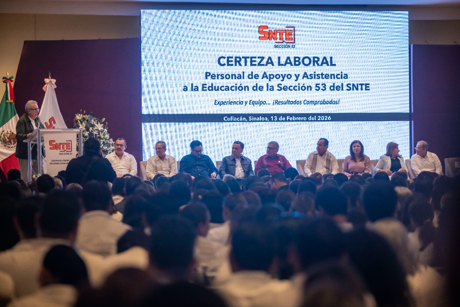 Culiacán, Sinaloa 13 de febrero de 2026.- Comprometido con otorgar certeza laboral al personal que garantiza una educación de calidad y entornos de aprendizaje seguros, el gobernador Rubén Rocha Moya, acompañó a Alfonso Cepeda Salas, secretario general del Sindicato Nacional de Trabajadores de la Educación y Ricardo Madrid Uriarte, líder de la sección 53 del SNTE, en cumplimiento de la defensa de los derechos de los trabajadores del magisterio hicieron entrega de un mil 58 memorándum de base a Personal de Apoyo y Asistencia a la Educación (PAAE), quienes desempeñan un papel fundamental en el funcionamiento integral de los centros escolares.