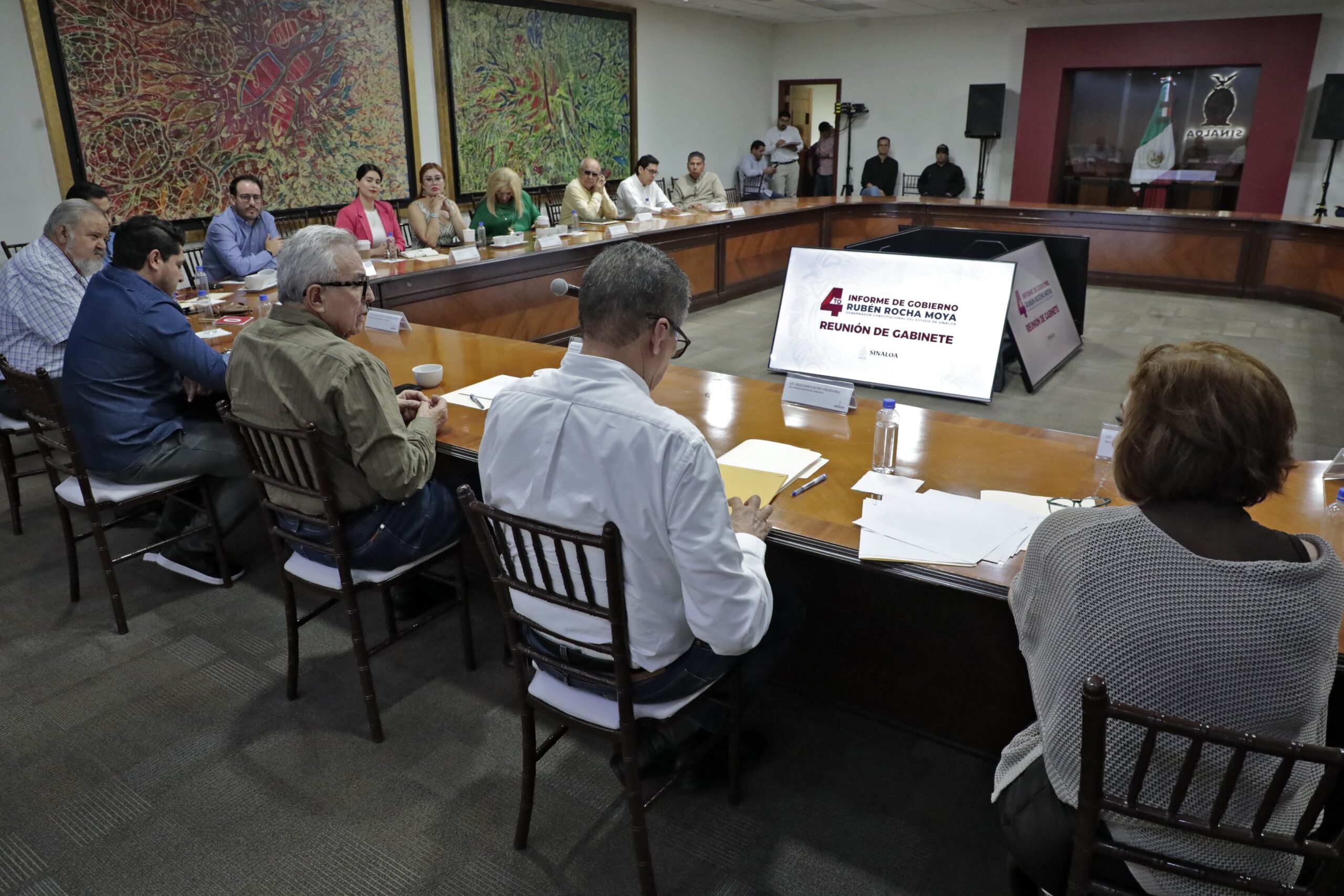 Culiacán ,Sinaloa 27 de agosto de 2025.- A fin de presentar resultados de las acciones ejecutadas en cada una de las dependencias gubernamentales que serán plasmadas en el documento del Cuarto Informe, el gobernador Rubén Rocha Moya, sostuvo una reunión con los integrantes del gabinete estatal, quienes expusieron los avances en cada una de las dependencias que representan y que contribuyen al desarrollo del estado y al bienestar de la sociedad sinaloense.