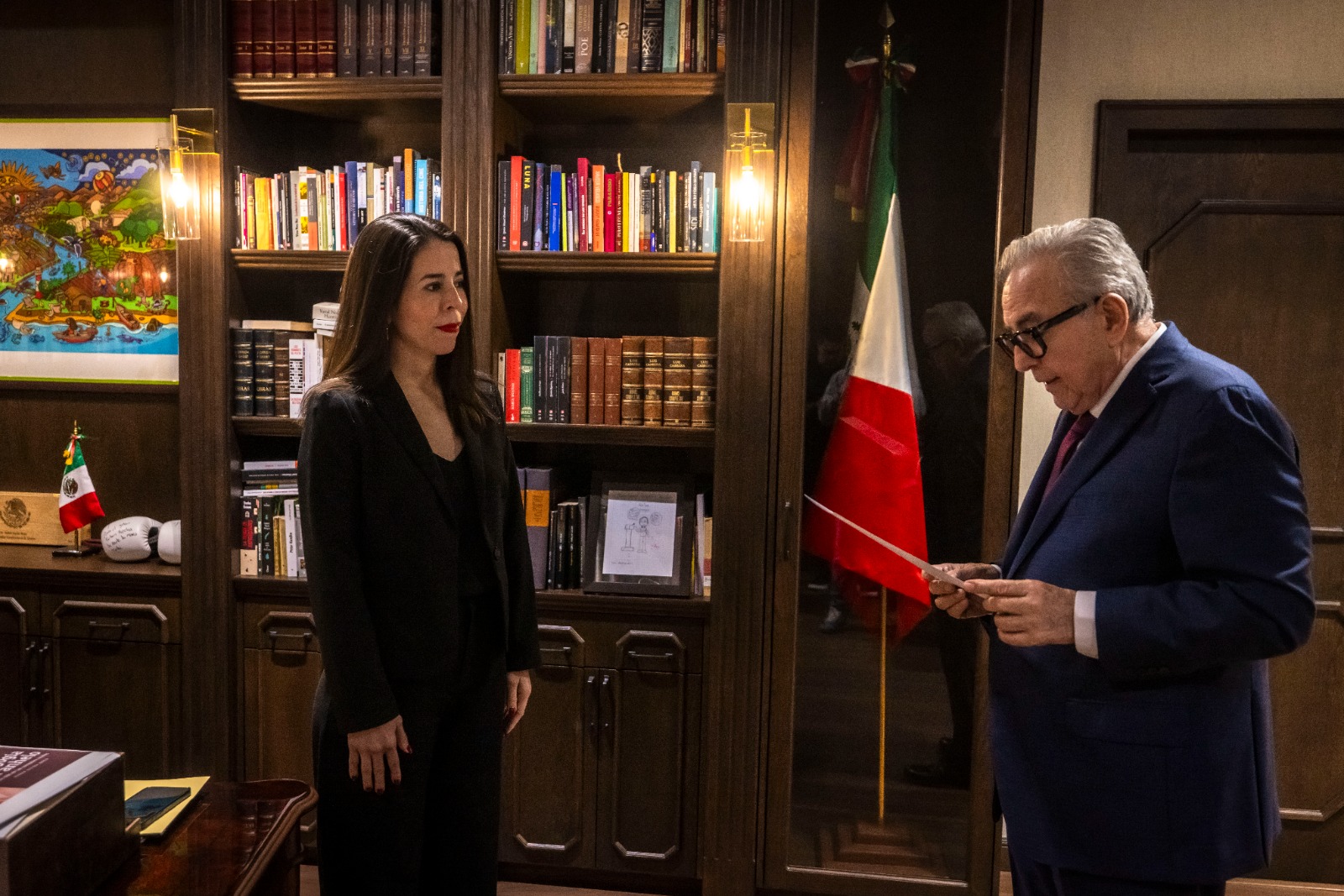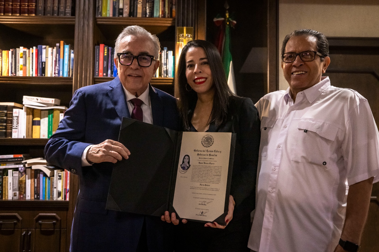 Culiacán, Sinaloa 27 de noviembre de 2025.- Impulsando el desarrollo, igualdad e inclusión de las mujeres en el ámbito profesional, el gobernador Rubén Rocha Moya, entregó Fíat de Notaria Pública a Raquel Arenas Cázares, como resultado de la aprobación del examen teórico práctico que presentó en función notarial.