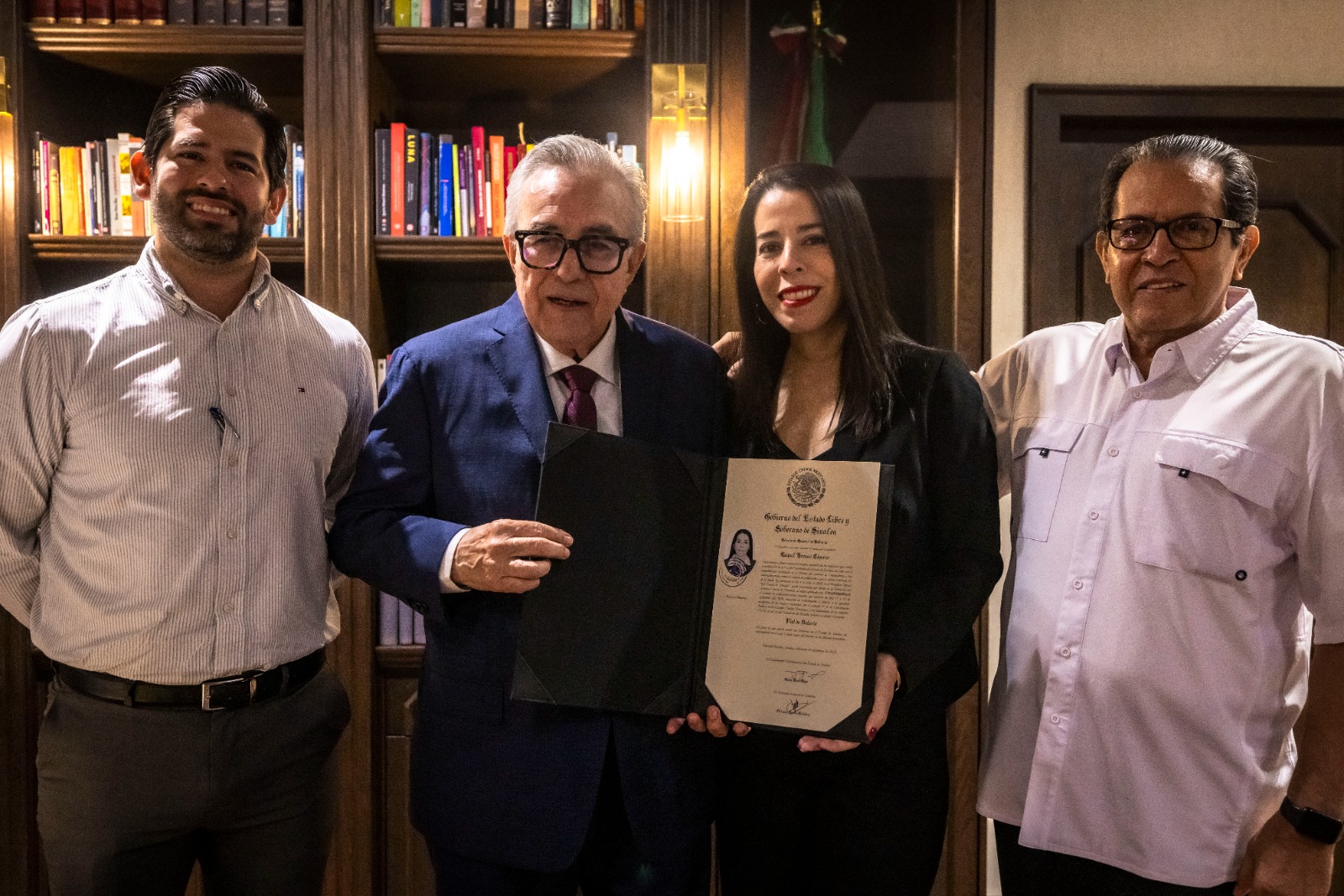 Culiacán, Sinaloa 27 de noviembre de 2025.- Impulsando el desarrollo, igualdad e inclusión de las mujeres en el ámbito profesional, el gobernador Rubén Rocha Moya, entregó Fíat de Notaria Pública a Raquel Arenas Cázares, como resultado de la aprobación del examen teórico práctico que presentó en función notarial.