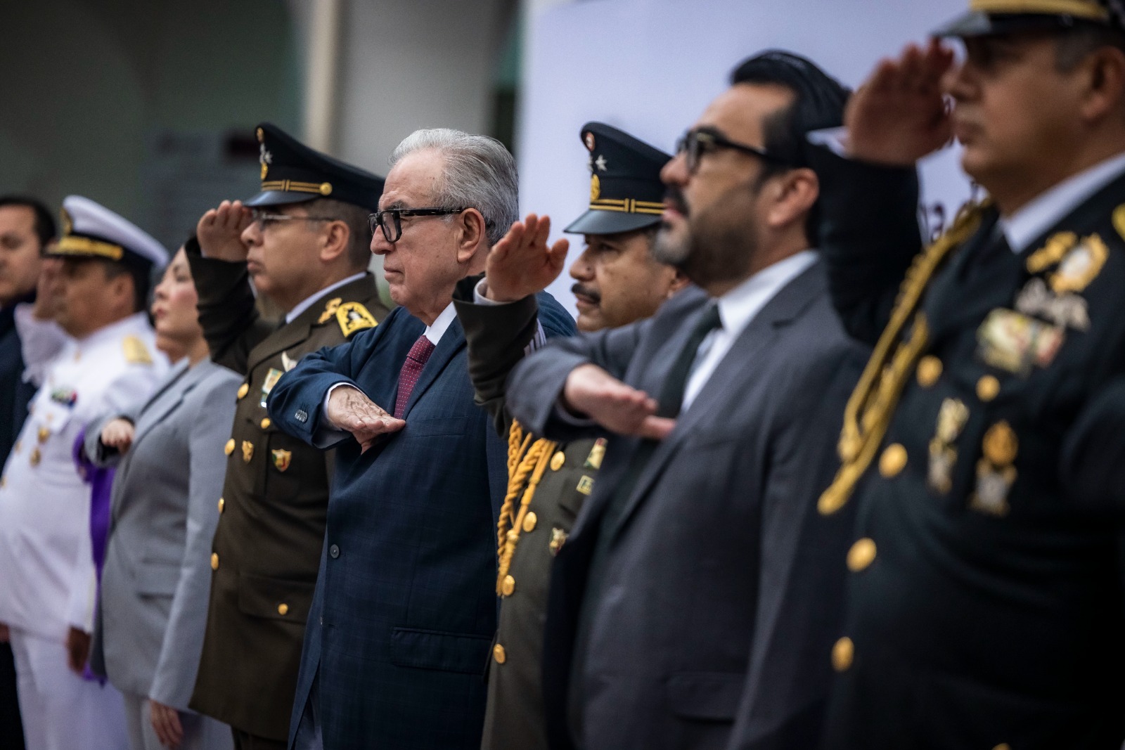 Para esta solemne ceremonia, que se realiza cada 20 de noviembre, el gobernador Rocha estuvo acompañado por la secretaria general de Gobierno, Yeraldine Bonilla Valverde; por el comandante de la Novena Zona Militar, General de Brigada, Santos Gerardo Soto; por el presidente del Supremo Tribunal de Justicia, magistrado Jesús Iván Chávez Rangel; por el presidente de la Mesa Directiva del Congreso del Estado, diputado Rodolfo Valenzuela Sánchez; por el Vicealmirante Sergio Reyes Rodríguez, inspector de la Cuarta Región Naval; por el General de Brigada Ulises Julián Tadeo González Calzada, coordinador estatal de la Guardia Nacional en Sinaloa; y como anfitrión, el presidente municipal de Culiacán, Juan de Dios Gámez Mendívil.