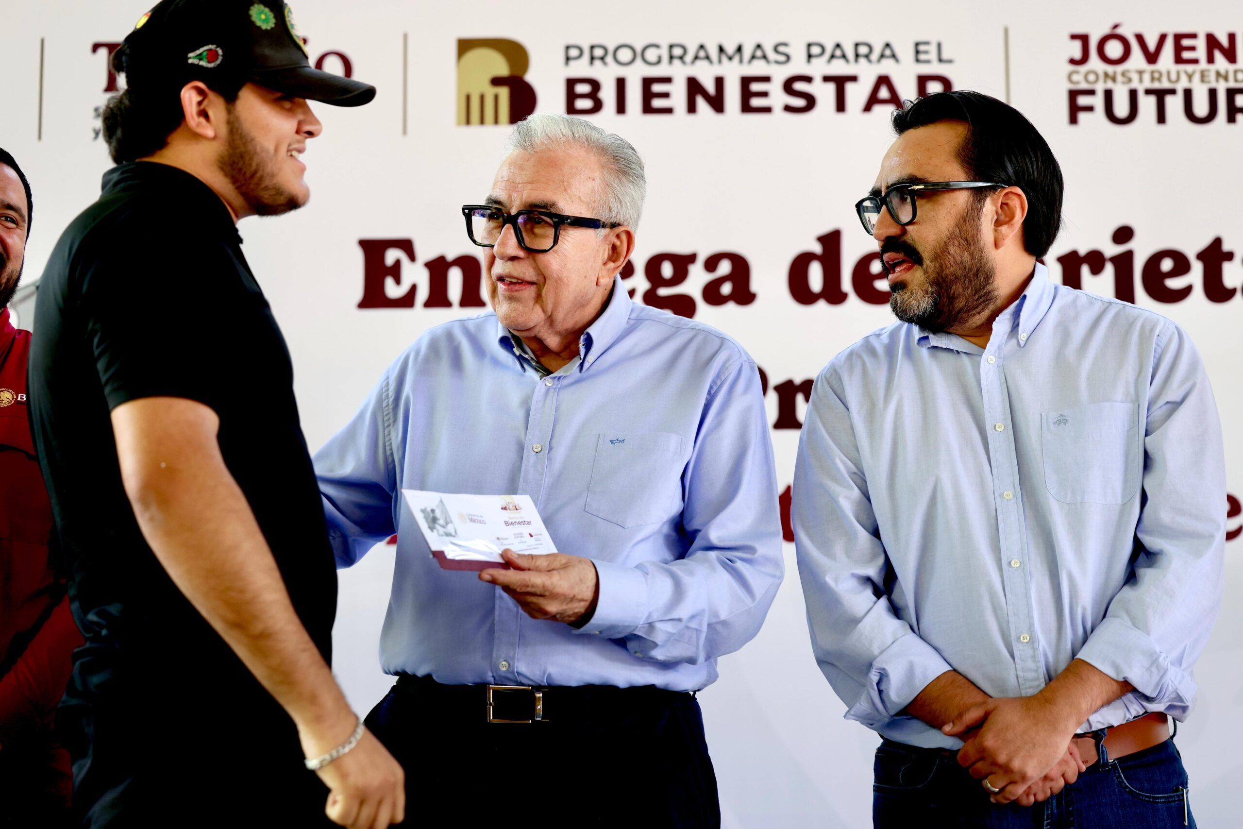 Acompañado por el presidente municipal de Culiacán, Juan de Dios Gámez Mendívil; y por el coordinador de los Programas del Bienestar en Sinaloa, Ángel Ulises Piña García, el mandatario estatal se reunió con cientos de jóvenes en las canchas deportivas del Parque Constitución, para la entrega de sus tarjetas del Bienestar, donde se les depositará mensualmente este apoyo otorgado por el gobierno de la presidenta de la República, Claudia Sheinbaum Pardo.