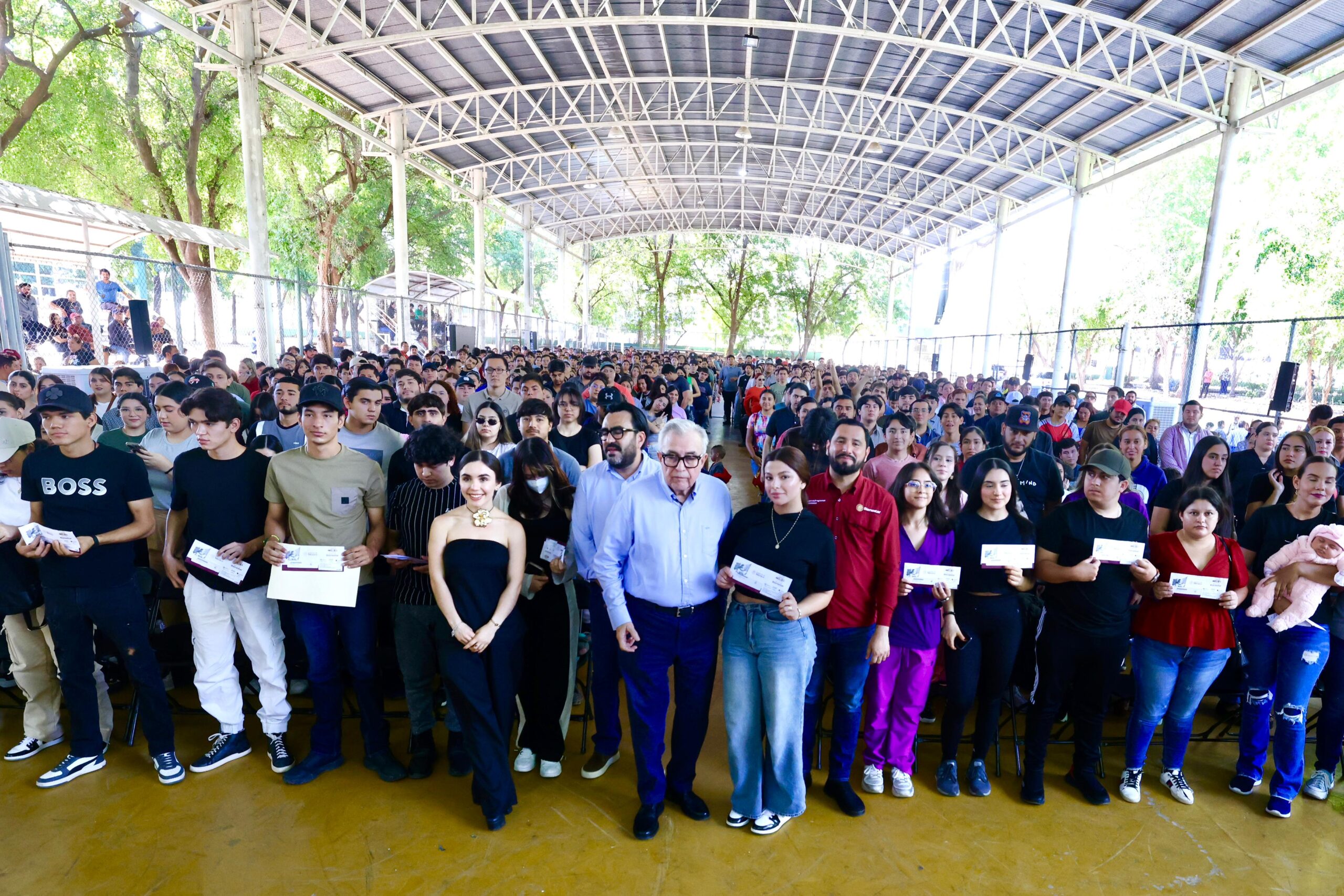 Culiacán, Sinaloa, a 5 de noviembre de 2025.- Con un llamado a aprovechar su capacitación para labrarse un futuro de porvenir, el gobernador Rubén Rocha Moya encabezó la entrega de sus tarjetas del Bienestar a más de 1 mil 250 jóvenes que a partir de ahora formarán parte del Programa Jóvenes Construyendo el Futuro, que consiste en una capacitación laboral durante los siguientes 12 meses, en los cuales recibirán como apoyo una beca de 8 mil 480 pesos mensuales.