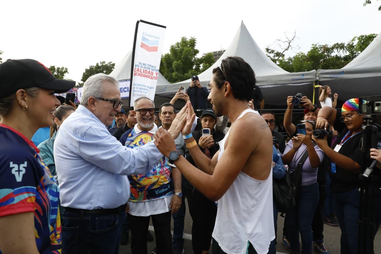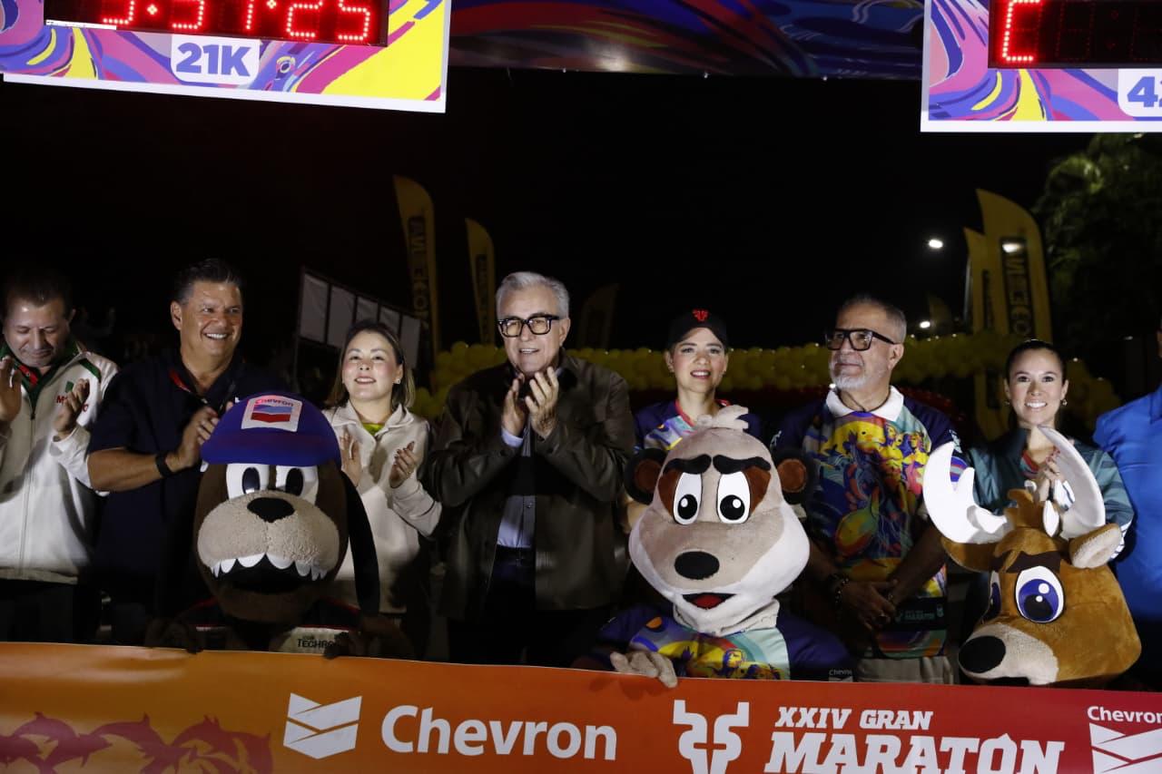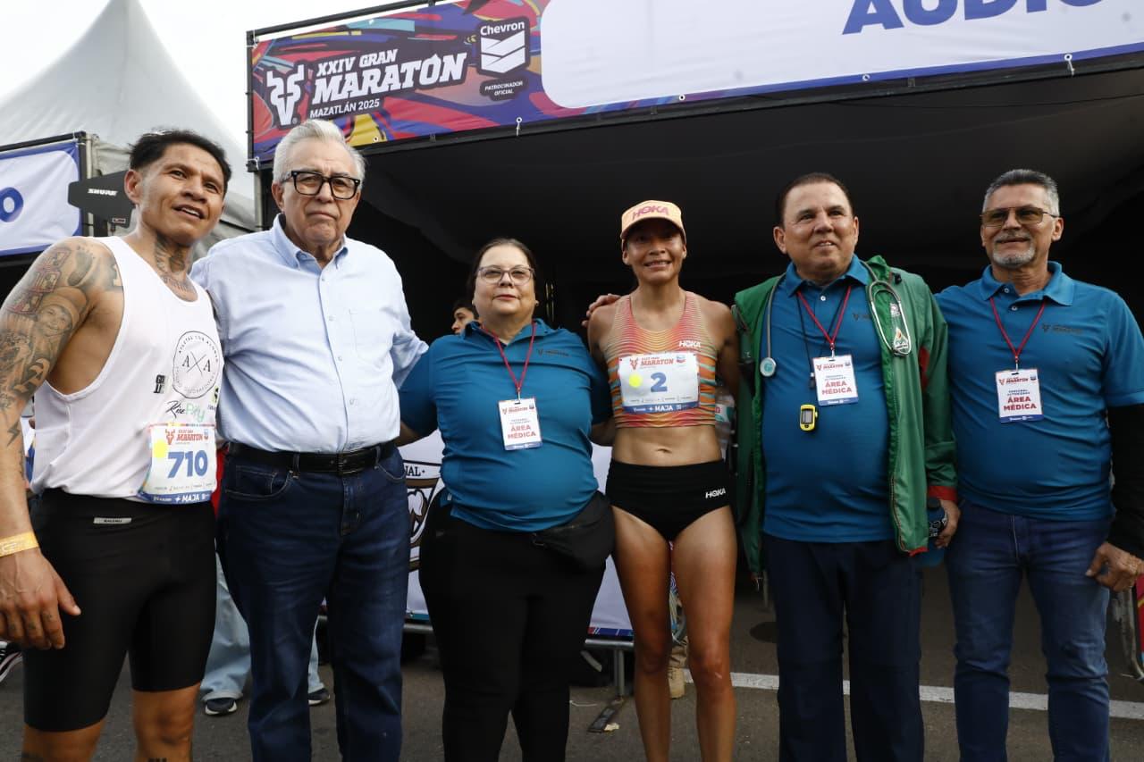 También lo acompañaron la secretaria general de Gobierno, Yeraldine Bonilla Valverde; la secretaria de Turismo, Mireya Sosa Osuna; la presidenta municipal de Mazatlán, Estrella Palacios Domínguez; el director del Fondo Empresarial de Chevron, Luis Roberto Ontiveros Zaragoza, y José Antonio Toledo Ortiz, presidente del Consejo de Administración del Grupo Venados de Mazatlán, por parte de los patrocinadores del maratón.