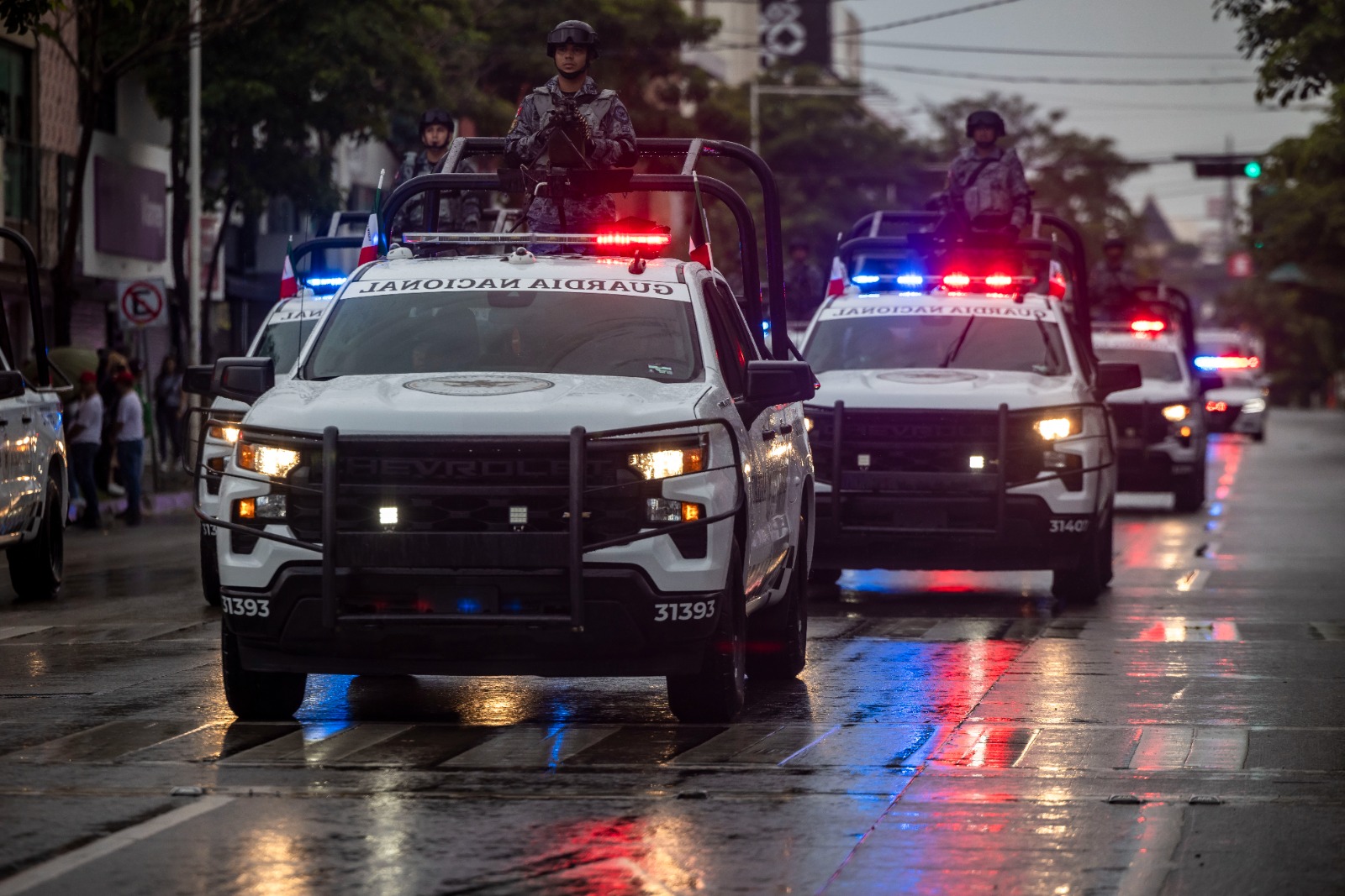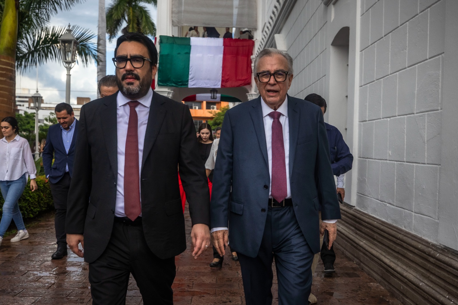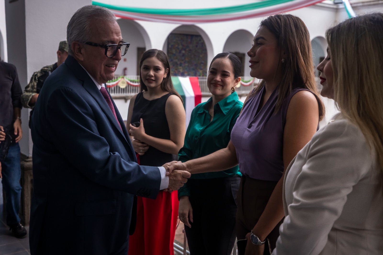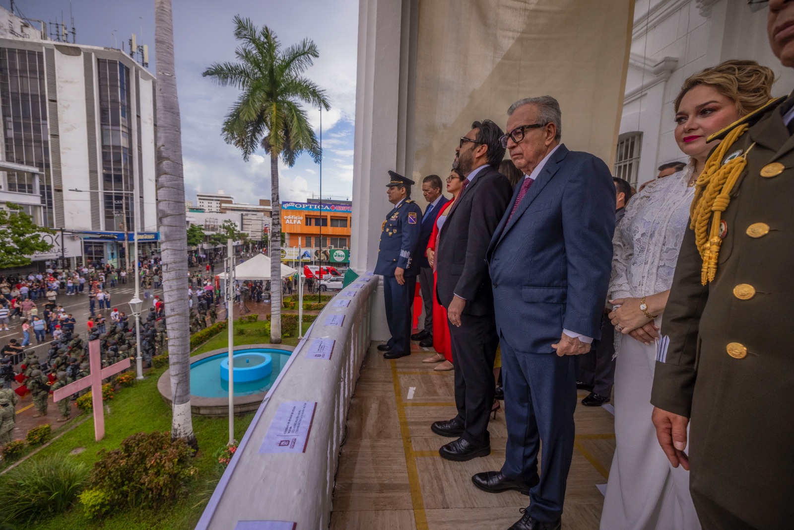 El mandatario estatal fue recibido en el edificio del Ayuntamiento, por el alcalde Juan de Dios Gámez Mendívil, para presenciar el desfile, que contó con la participación de 1,185 militares y 120 oficiales de la PEP, efectivos del Ejército, Fuerza Aérea, Marina Armada de México, Guardia Nacional, Policía estatales y municipales.