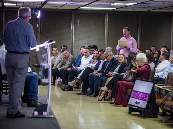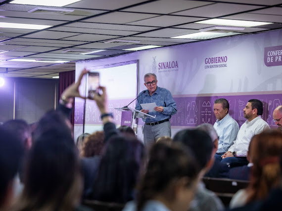 Durante la conferencia, el secretario de Economía, Ricardo Velarde Cárdenas, enfatizó que el desarrollo económico se construye en equipo y que el comercio y los servicios son los sectores que más impulsan la economía sinaloense.