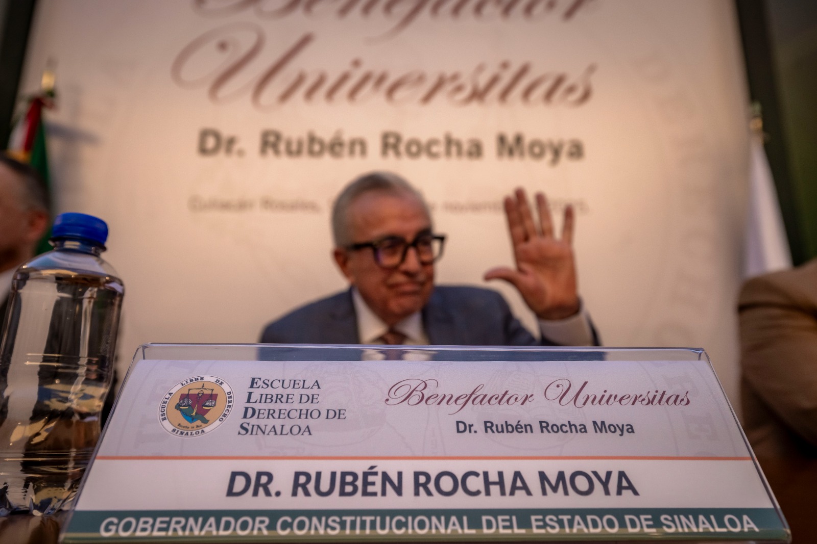 Culiacán, Sinaloa, a 25 de noviembre de 2025.- En reconocimiento por el apoyo otorgado a la Escuela Libre de Derecho de Sinaloa, dicha institución de educación superior otorgó al gobernador Rubén Rocha Moya la distinción académica “Benefactor Universitas”, en una sesión solemne de su Consejo General, donde el mandatario estatal recibió una placa de reconocimiento y le fue colocado un pin distintivo, frente a la comunidad universitaria.