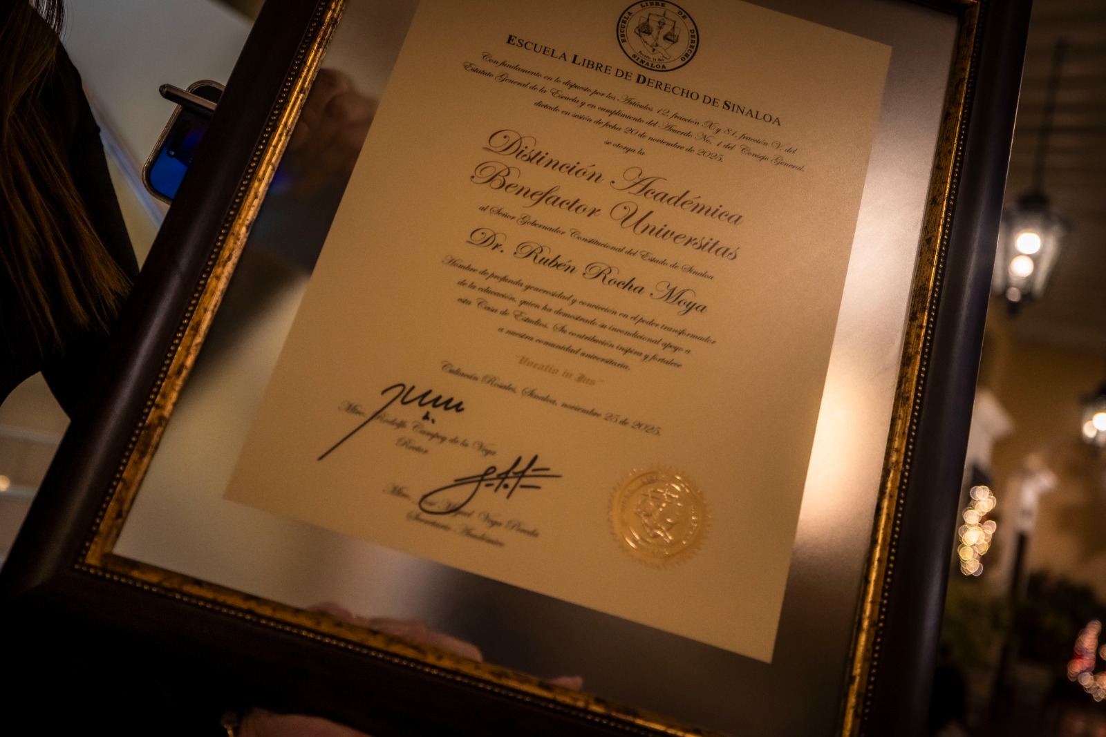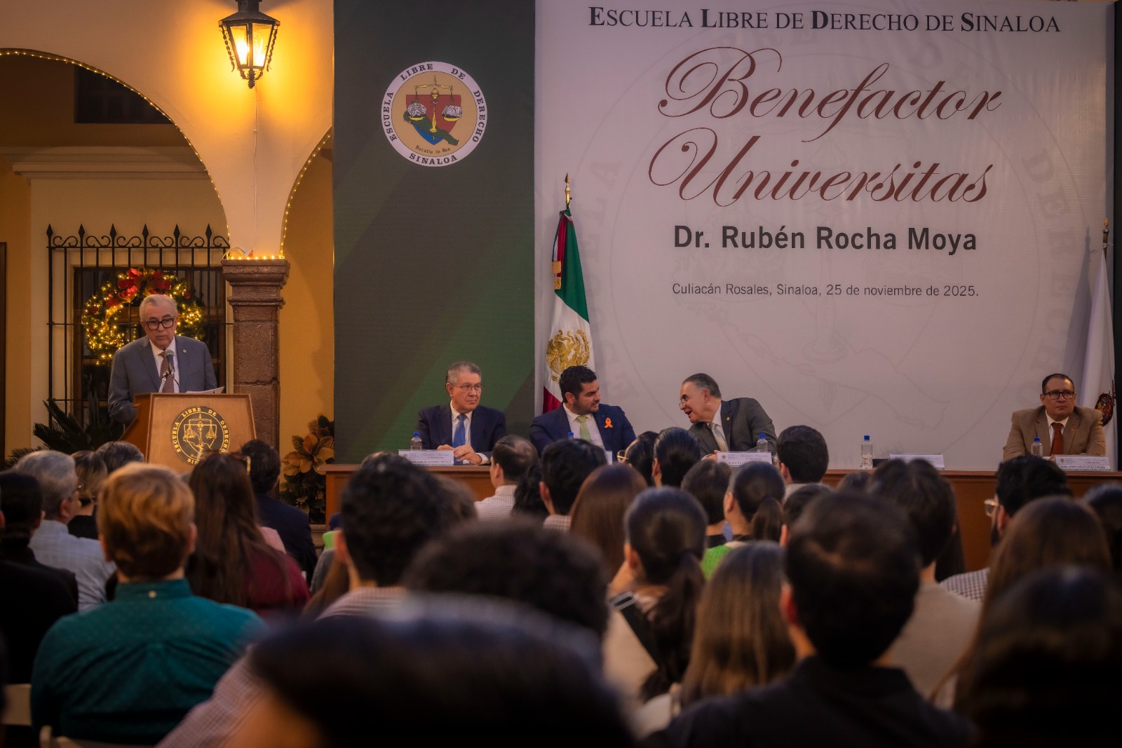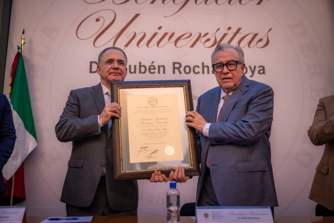 Culiacán, Sinaloa, a 25 de noviembre de 2025.- En reconocimiento por el apoyo otorgado a la Escuela Libre de Derecho de Sinaloa, dicha institución de educación superior otorgó al gobernador Rubén Rocha Moya la distinción académica “Benefactor Universitas”, en una sesión solemne de su Consejo General, donde el mandatario estatal recibió una placa de reconocimiento y le fue colocado un pin distintivo, frente a la comunidad universitaria.