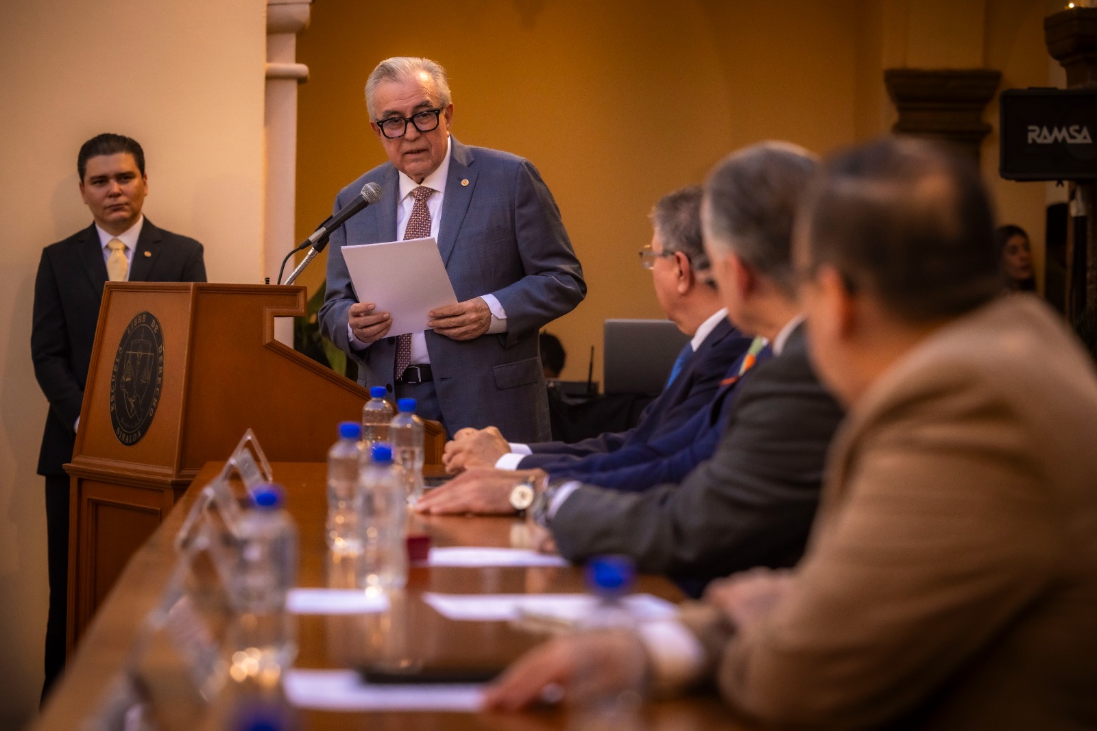 También asistieron como invitados especiales a esta sesión solemne, el presidente del Supremo Tribunal de Justicia, y egresado de la Escuela Libre de Derecho de Sinaloa, el magistrado Jesús Iván Chávez Rangel; el presidente de la Mesa Directiva del Congreso del Estado, el diputado Rodolfo Valenzuela Sánchez; la secretaria general de Gobierno, Yeraldine Bonilla Valverde; la secretaria de Educación Pública y Cultura, Gloria Himelda Félix Niebla; y el rector honorario de esta institución, José Carlos Álvarez Ortega, quien actualmente es rector de la Universidad del Policía