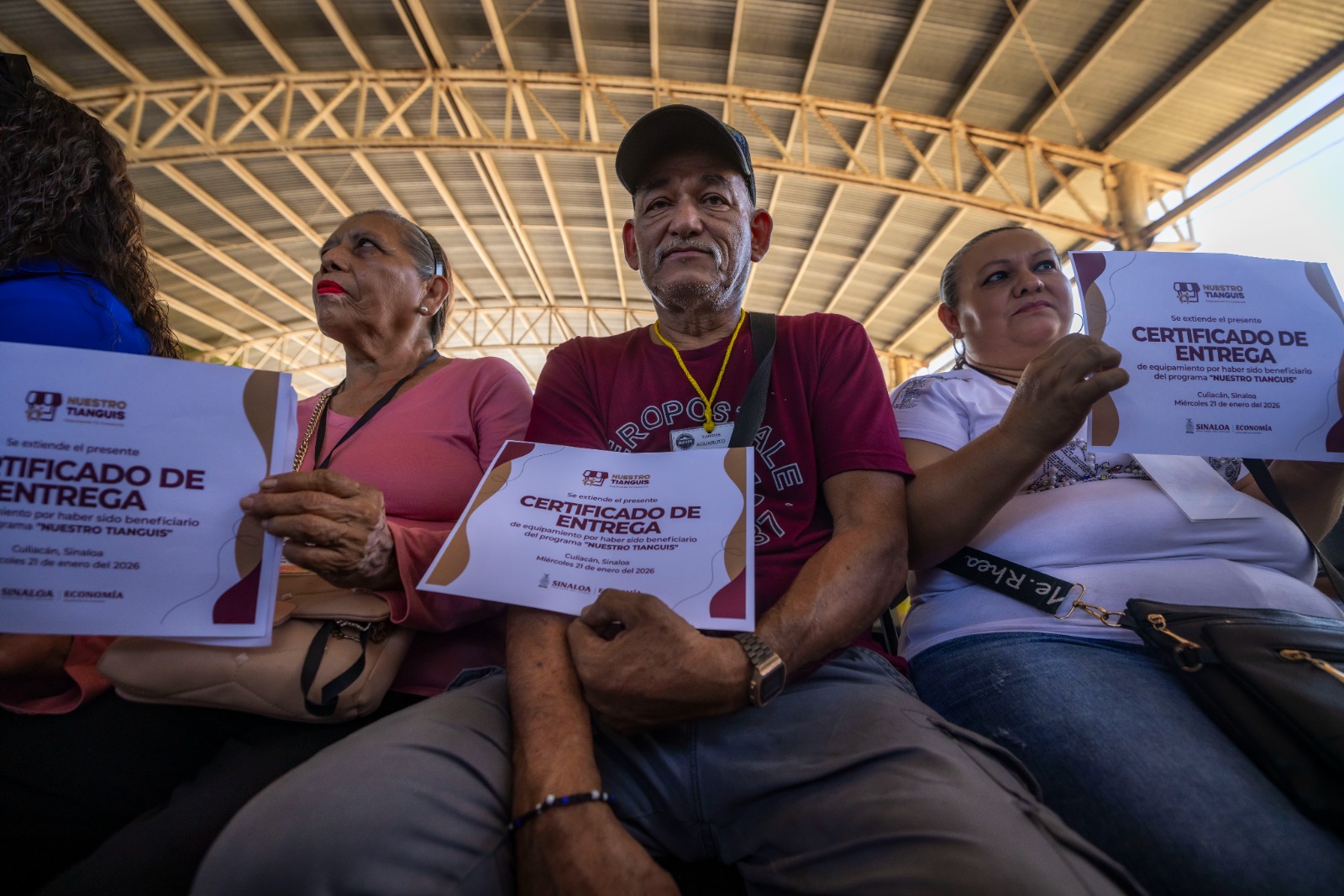 Culiacán, Sinaloa 21 de enero de 2026.- Impulsando el desarrollo económico popular y el autoempleo, el gobernador Rubén Rocha Moya, encabezó la entrega de 300 apoyos del programa “Nuestro Tianguis”, una iniciativa estatal que ofrece herramientas de capacitación y equipamiento gratuito para mejorar el negocio de los pequeños comerciantes, con ello, dignificando el trabajo de las y los tianguistas brindándoles herramientas para mejorar sus ingresos y condiciones de trabajo.