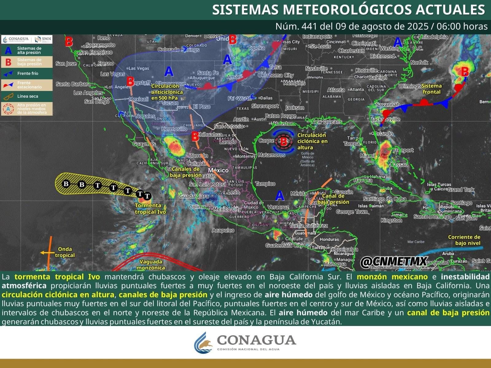 Sinaloa. – El Servicio Meteorológico Nacional (SMN) informó que este viernes 9 de agosto se prevén lluvias fuertes con acumulaciones de hasta 50 mm en el norte del estado de Sinaloa, derivadas de la influencia del monzón mexicano, el cual está generando condiciones de inestabilidad atmosférica en la región noroeste del país.